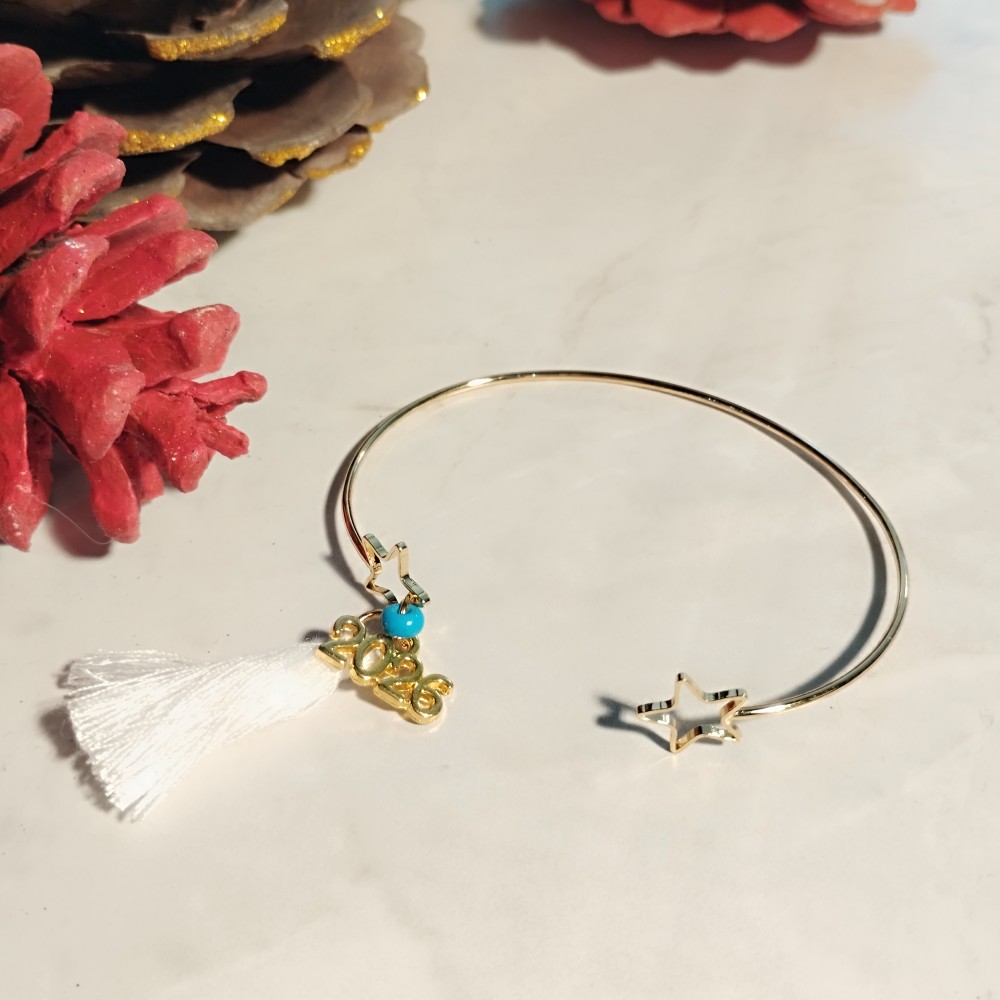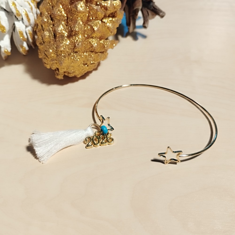 Οικονομικό χειροποίητο Γούρι 2026 βραχιόλι σε βέργα επίχρυση με τελειώματα δυο αστέρια.