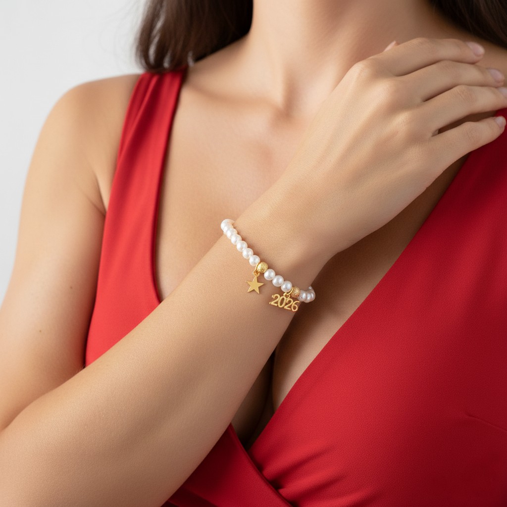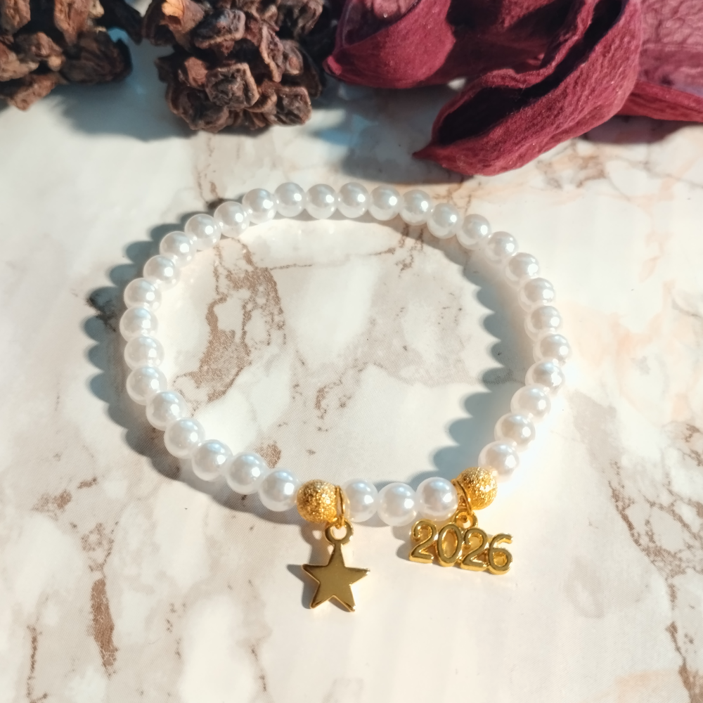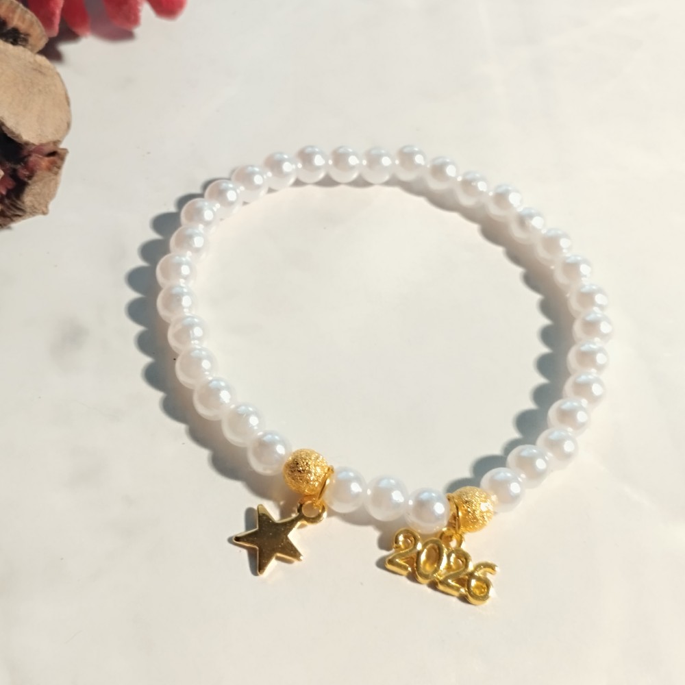 Βραχιόλι Γούρι 2026 Ελαστικό με λευκές και επίχρυσες Πέρλες