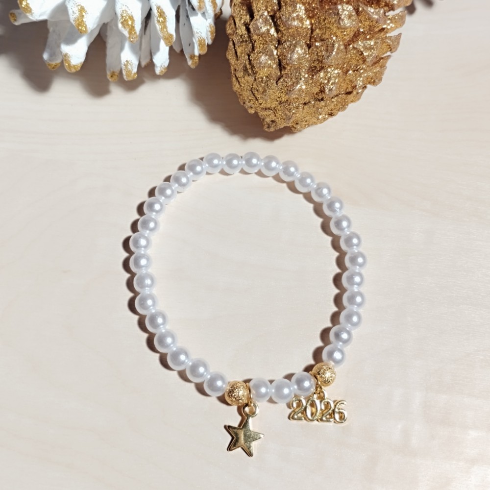 Οικονομικό χειροποίητο Γούρι 2026 βραχιόλι ελαστικό με λευκές και επίχρυσες πέρλες.