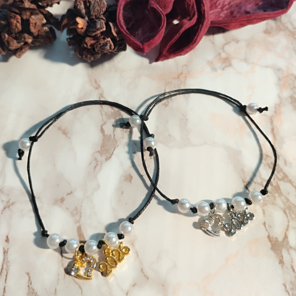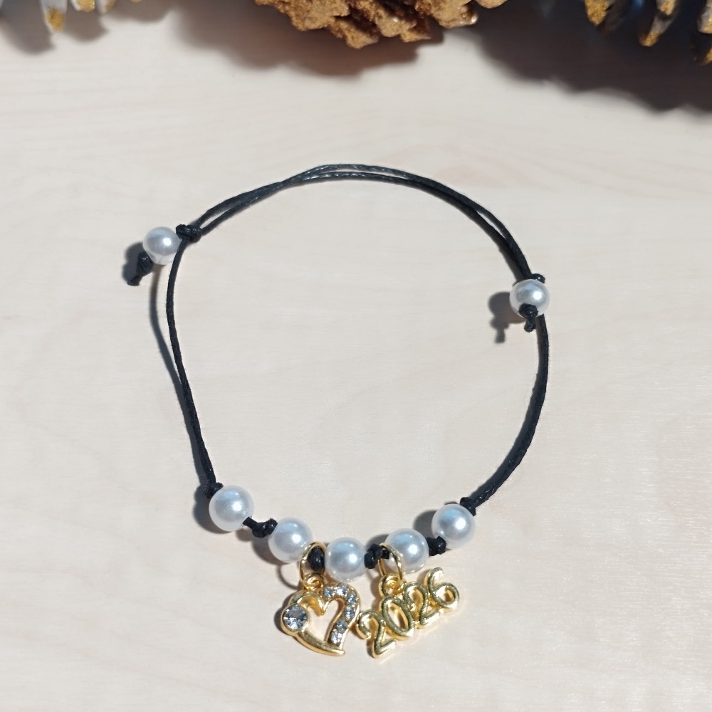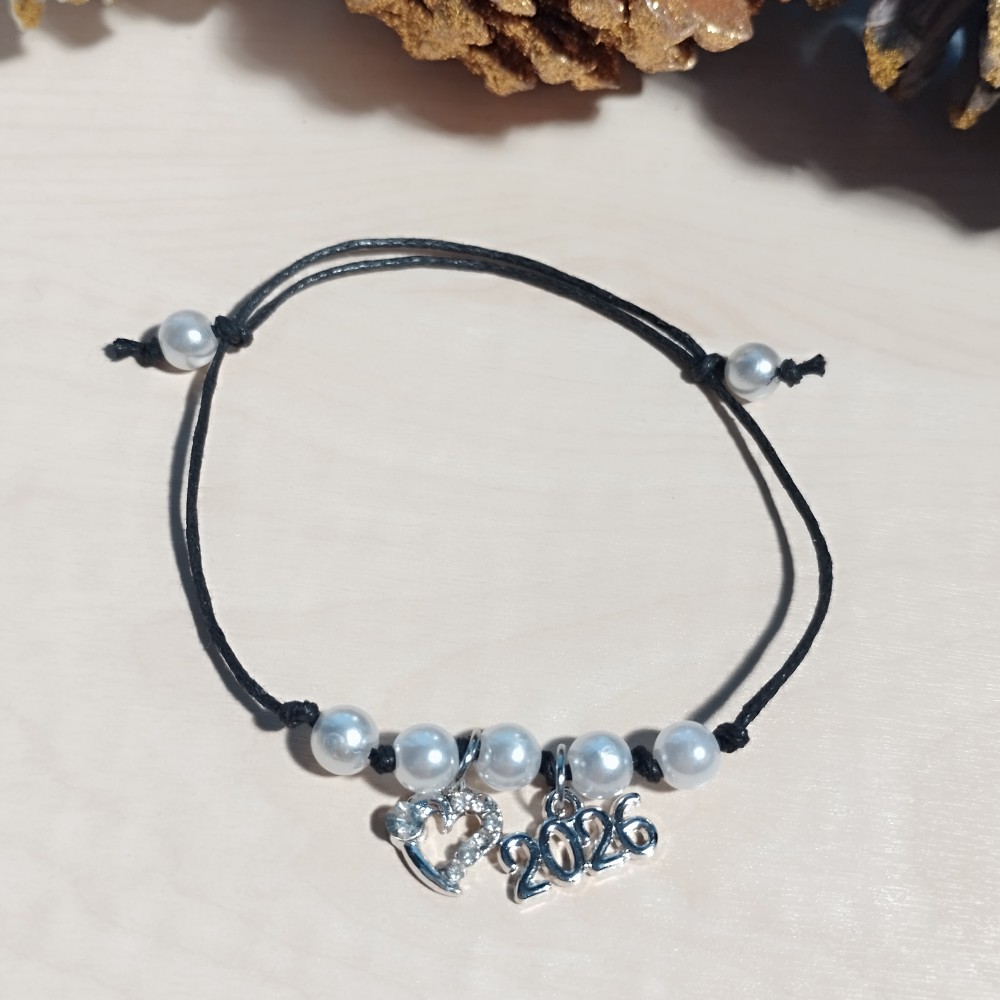Βραχιόλι Γούρι 2026 με μαύρο κορδόνι Πέρλες και καρδιά με Στρας