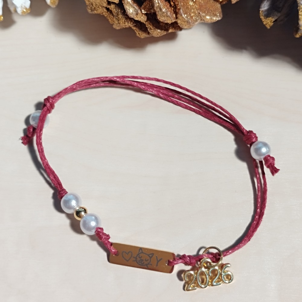 Οικονομικό χειροποίητο Γούρι 2026 βραχιόλι με μπορντό κορδόνι και επίχρυσό στοιχείο ΓΑΤΑ, αυξομειούμενο.