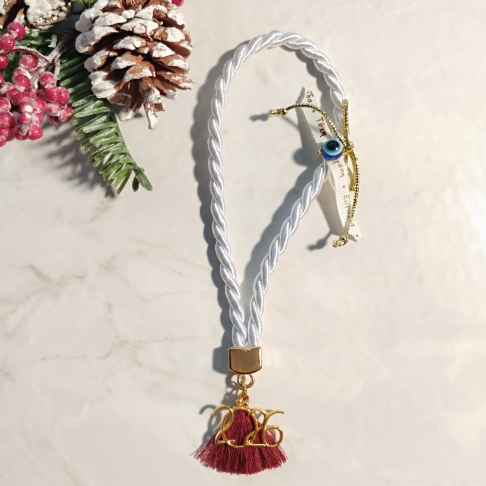 Χειροποίητο, οικονομικό γούρι μπρελόκ 2026 με χοντρό εκρού γυαλιστερό κορδόνι.