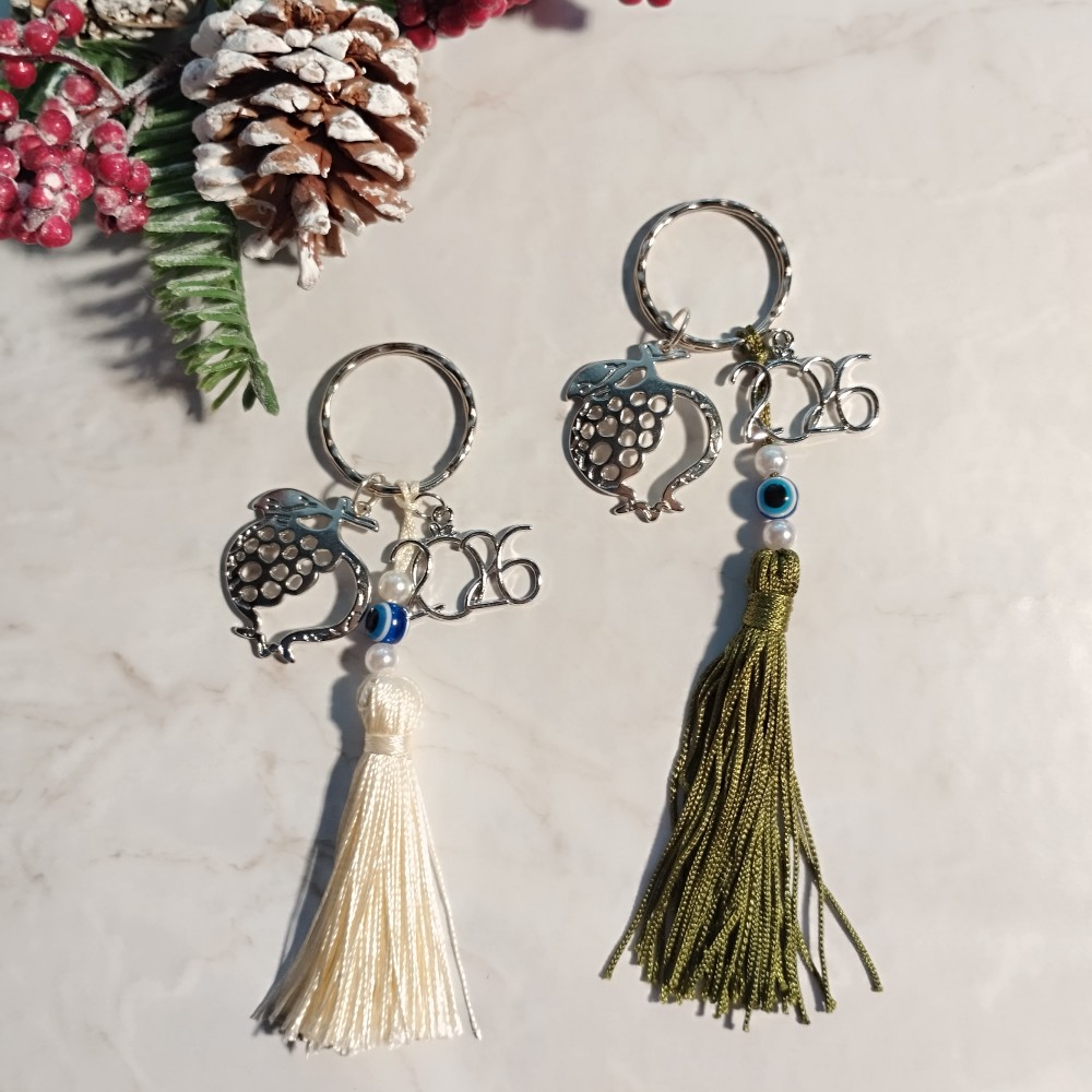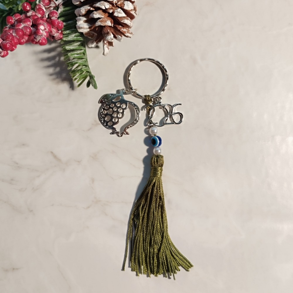 Γούρι Μπρελόκ 2026 με ασημί Μεταλλικό Ρόδι και φούντα