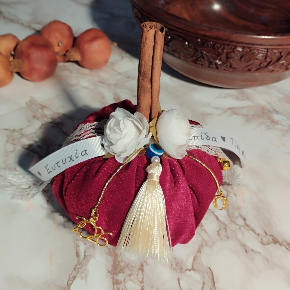 Μεγάλη κολοκύθα σε μπορντό βελούδο με δαντέλα και κορδέλα με ευχές.