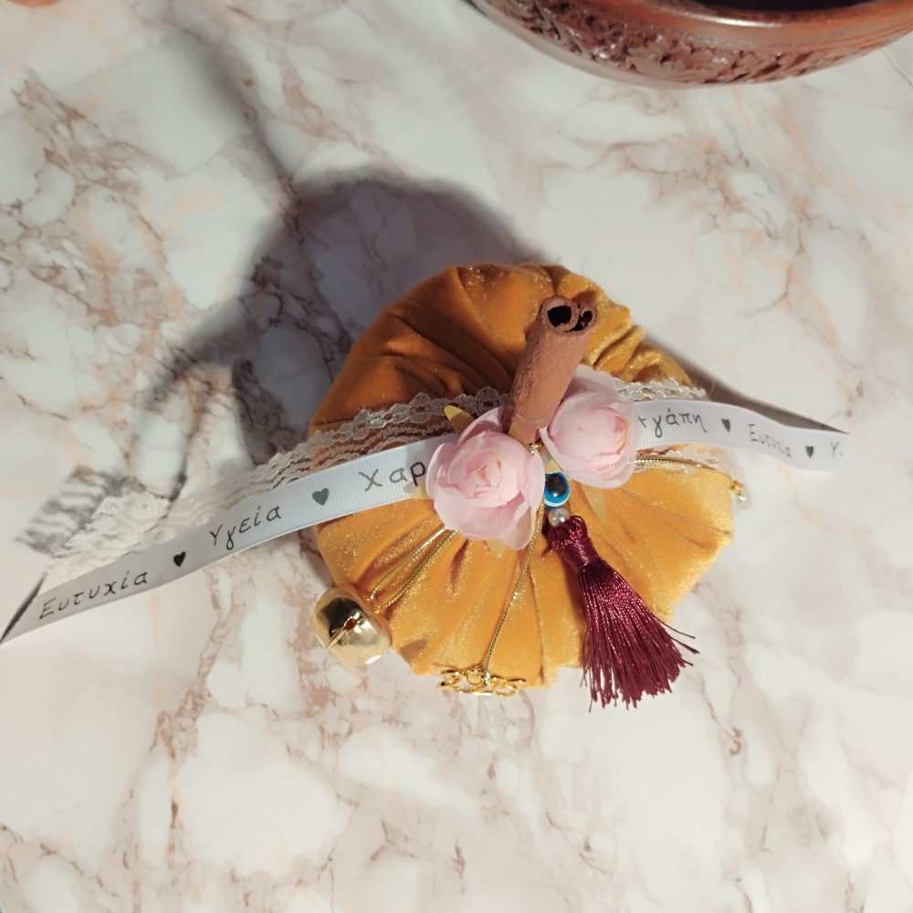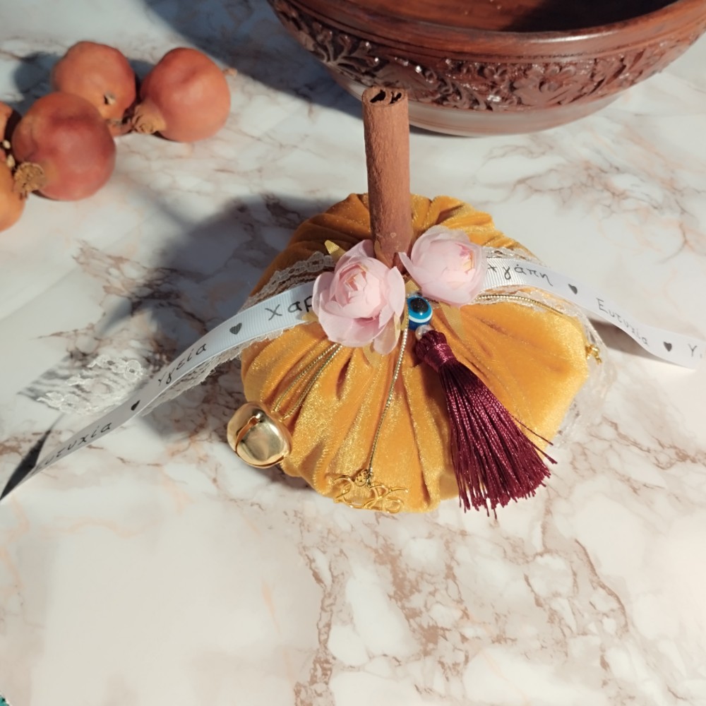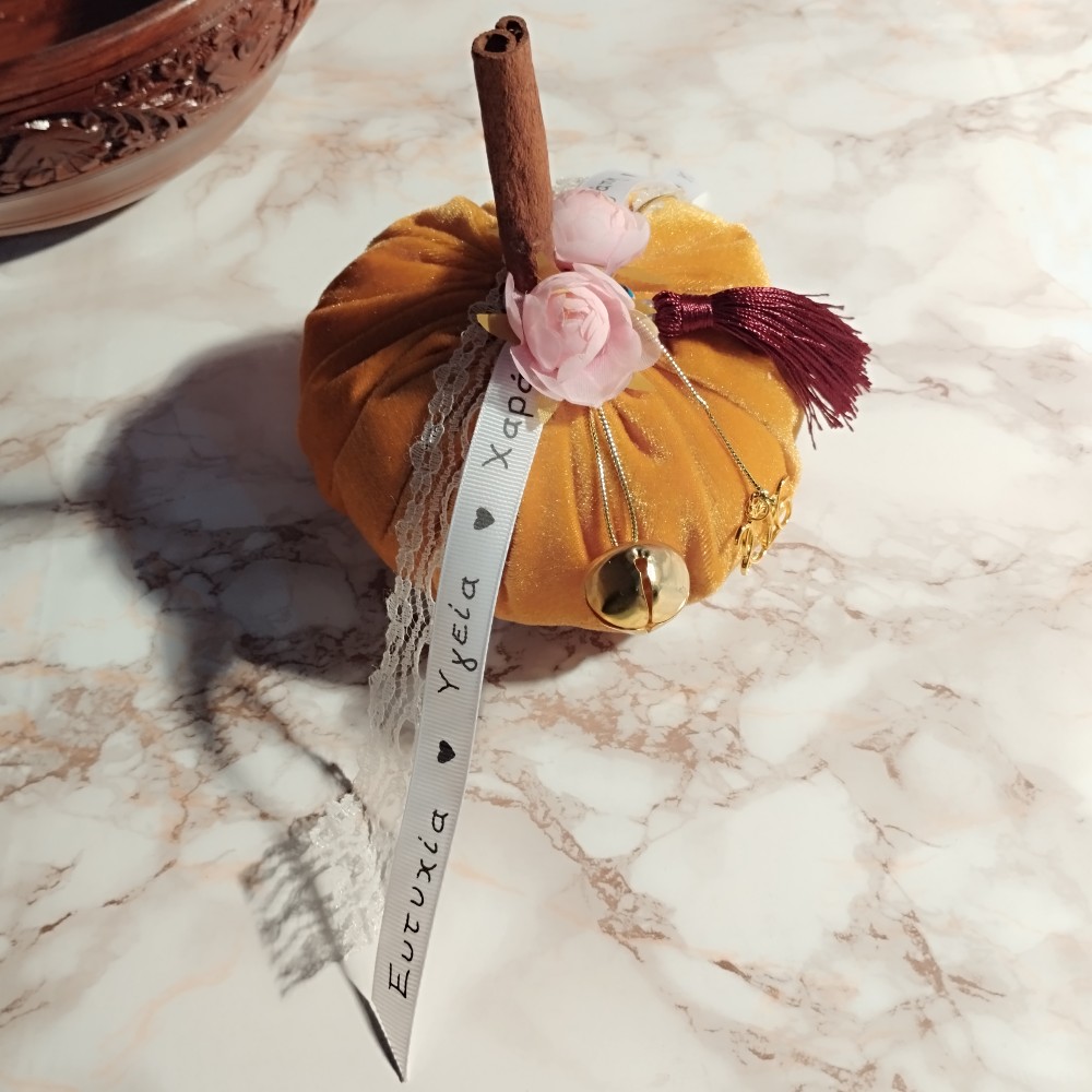 Μεγάλη κολοκύθα σε χρυσό βελούδο με δαντέλα και κορδέλα με ευχές.