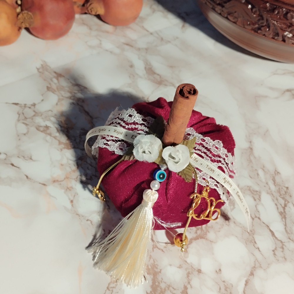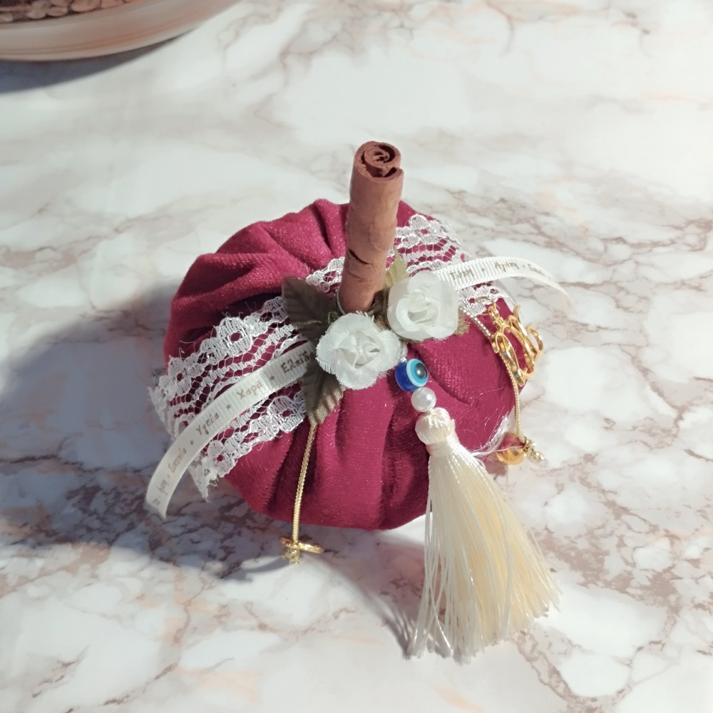 Μεσαία κολοκύθα σε μπορντό βελούδο με δαντέλα και κορδέλα με ευχές.