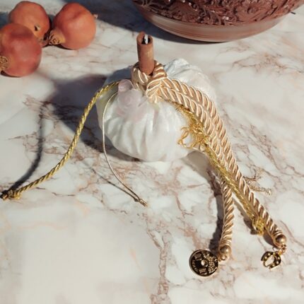 Στολισμένη με χρυσό κουδούνι, πέταλο και εκρού φούντα με μπλε μάτι.