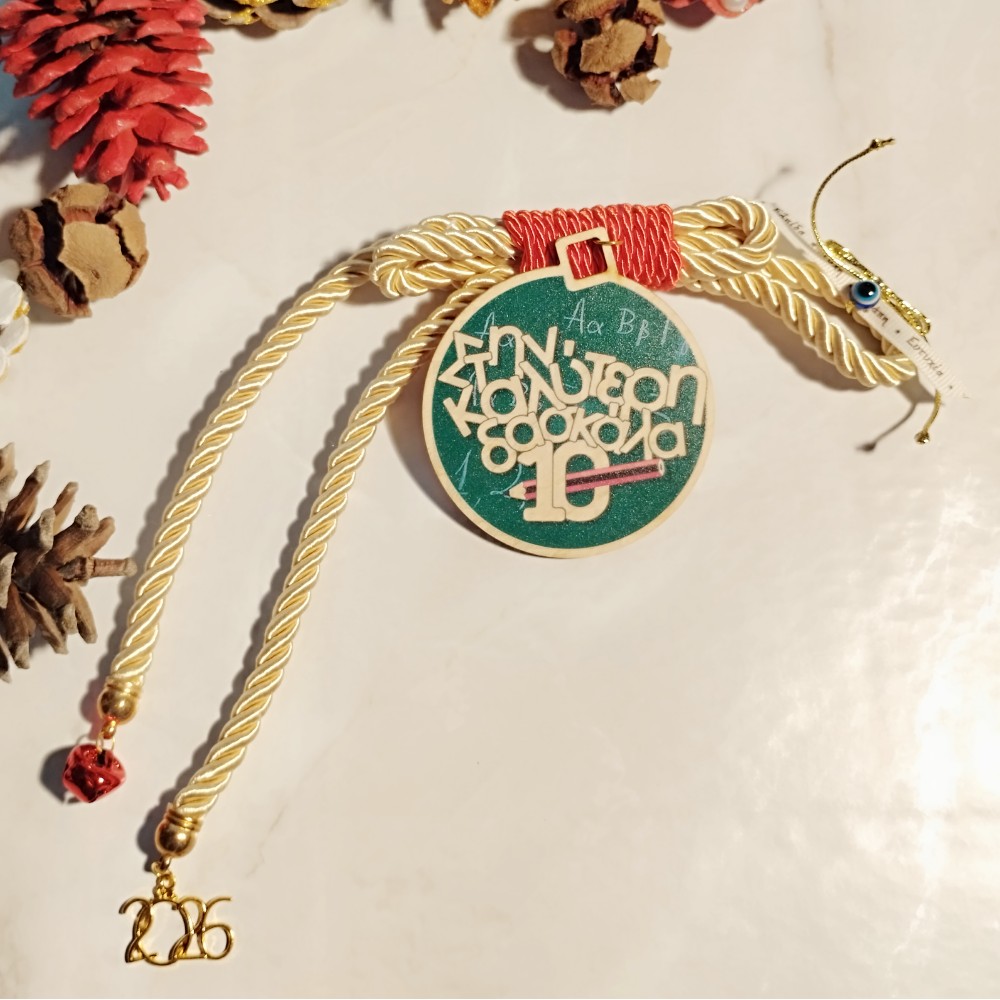 Χειροποίητο, οικονομικό, κρεμαστό γούρι 2026 με ξύλινο στοιχείο “ΣΤΗ ΚΑΛΥΤΕΡΗ ΔΑΣΚΑΛΑ”.