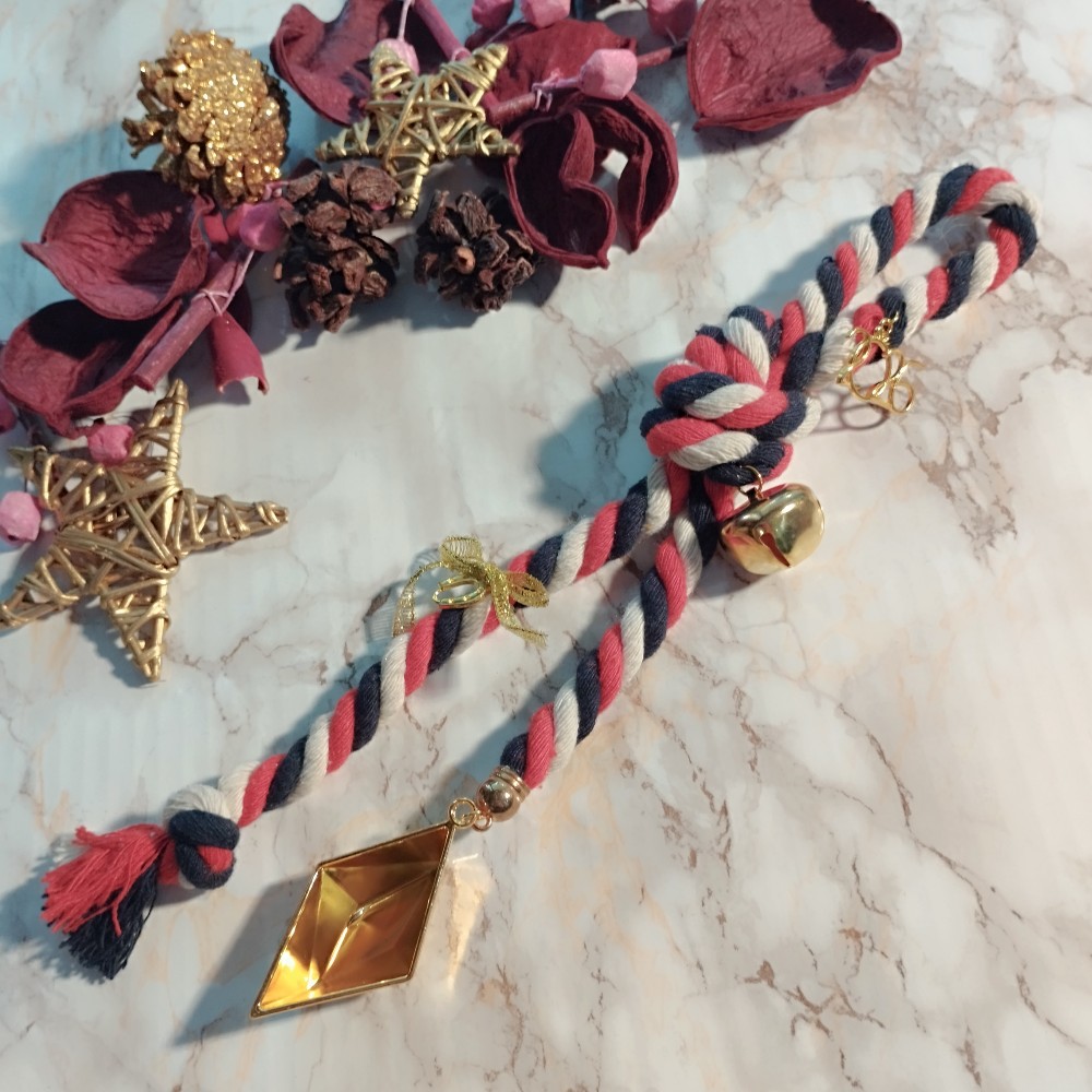 Με χοντρό βαμβακερό κορδόνι σε κόκκινο, μπλε και εκρού.