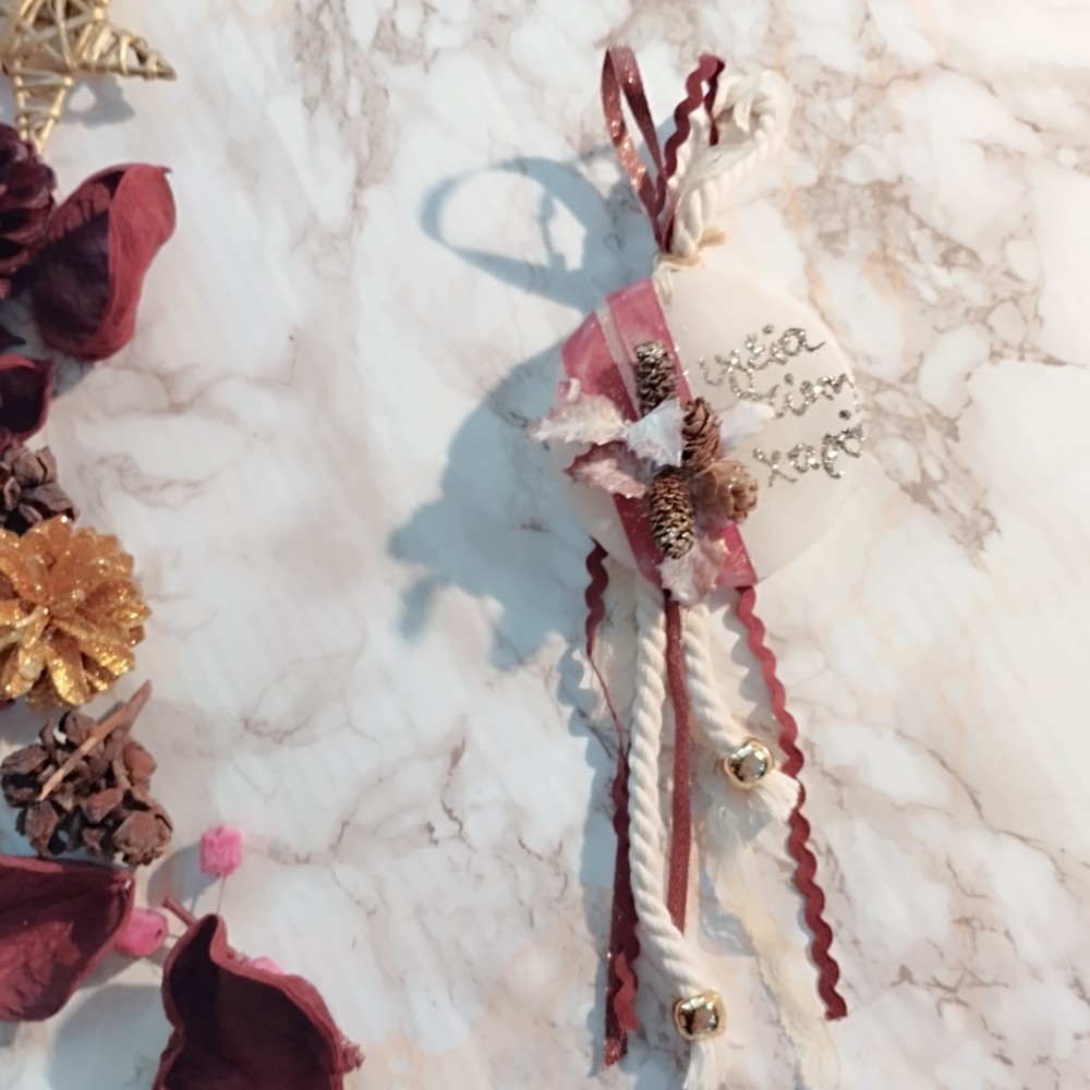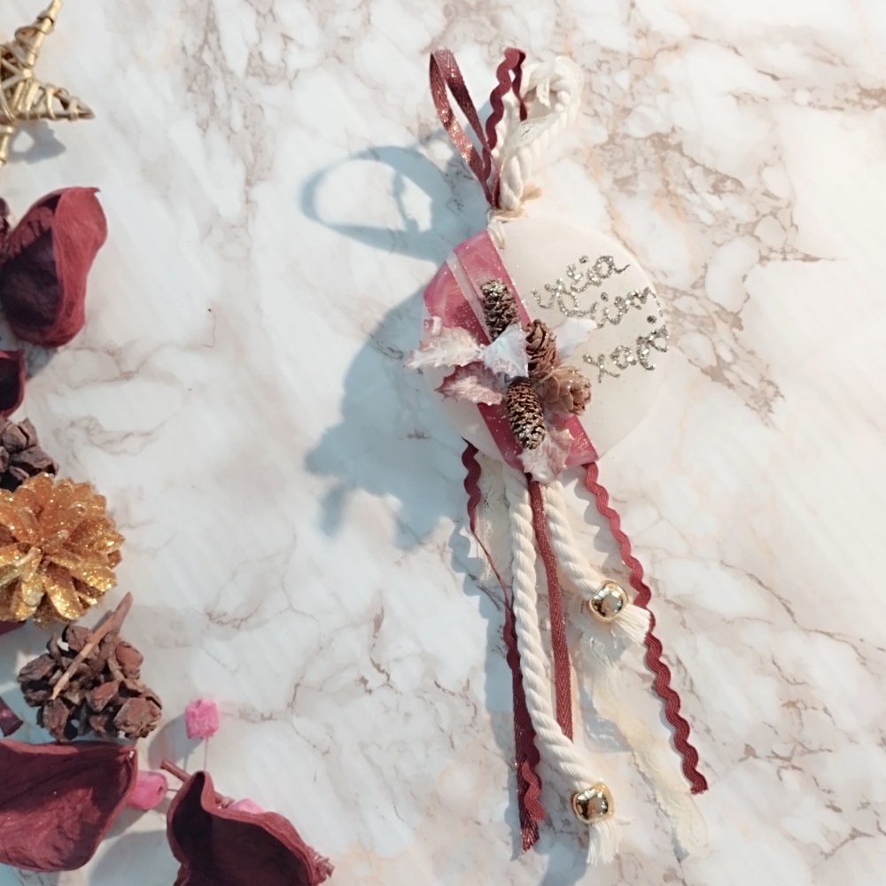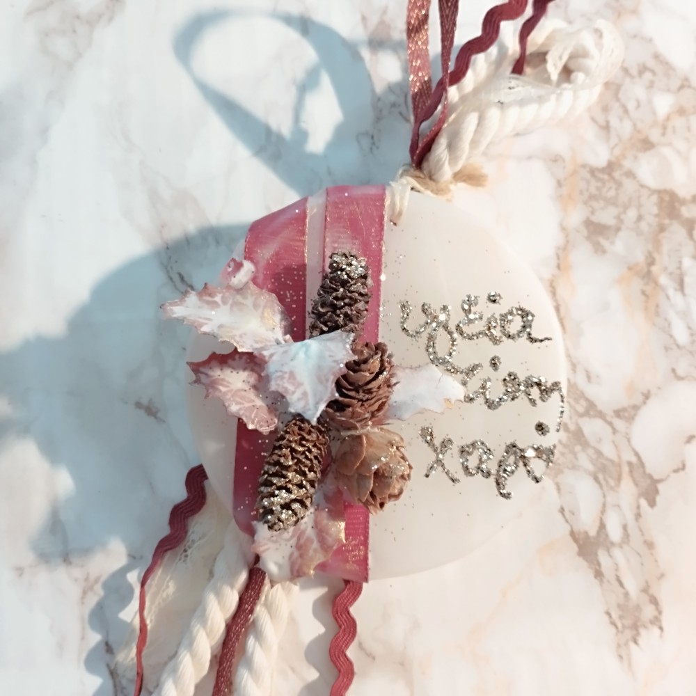 Χειροποίητο, οικονομικό, κρεμαστό γούρι 2026 σε στρογγυλό χειροποίητο αρωματικό κερί με ευχές “Υγεία- Τύχη- Χαρά” από χρυσόσκονη.