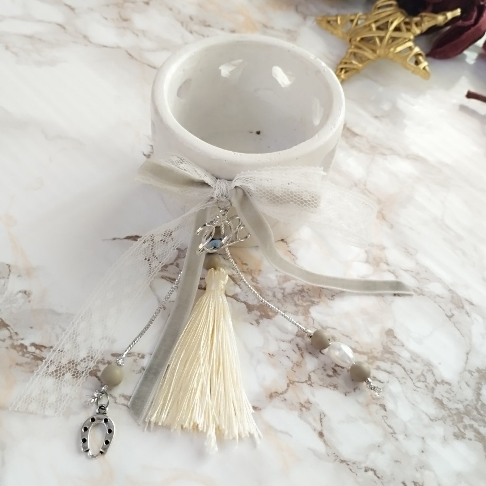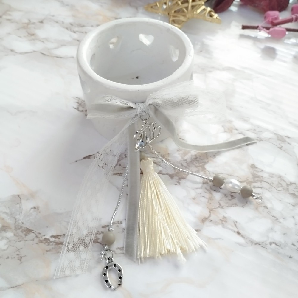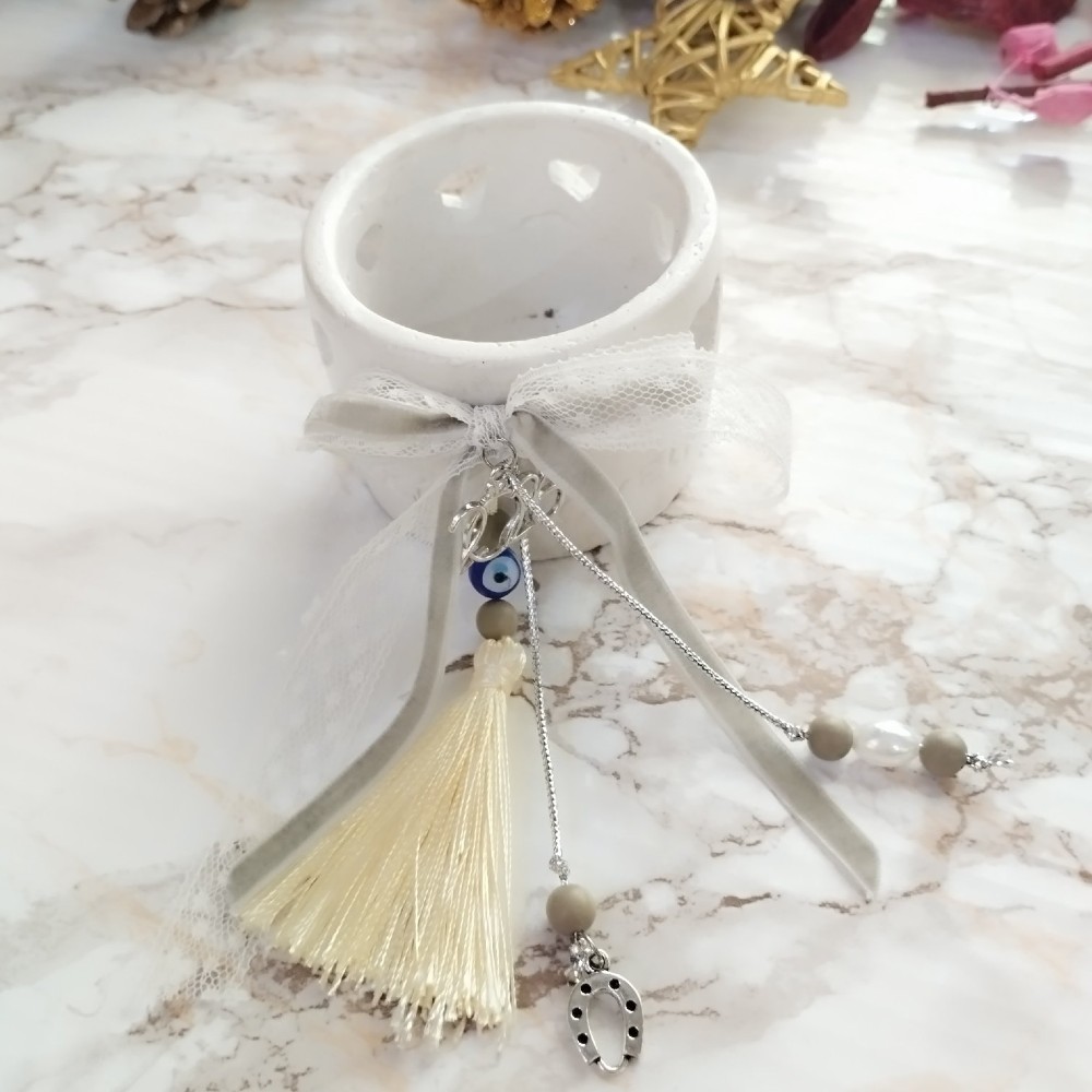 Στολισμένο με ασημί πέταλο, πουά λευκή δαντέλα, γκρι βελούδινη κορδέλα και εκρού φούντα με πέρλες.