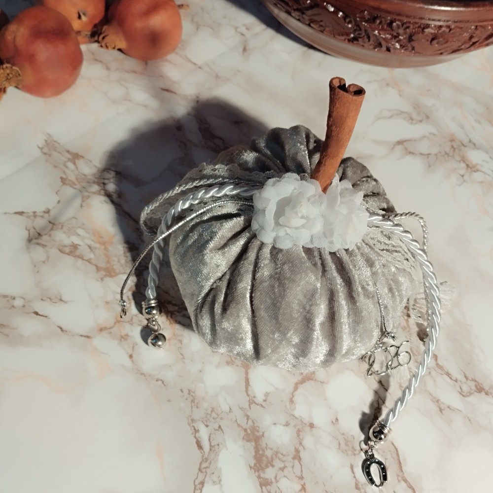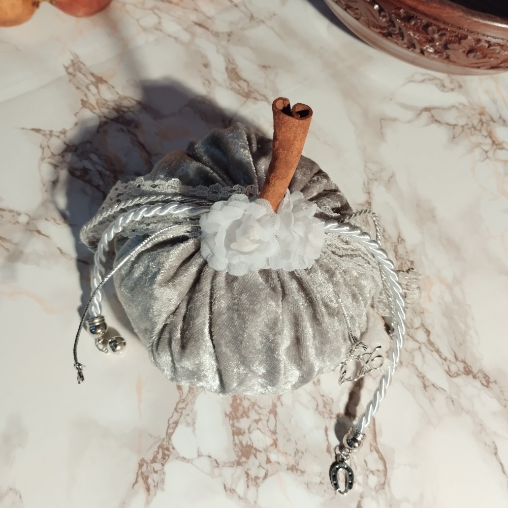 Γούρι 2026 Κολοκύθα Μεγάλη Βελούδο ασημί με λευκό κορδόνι και Λουλούδια