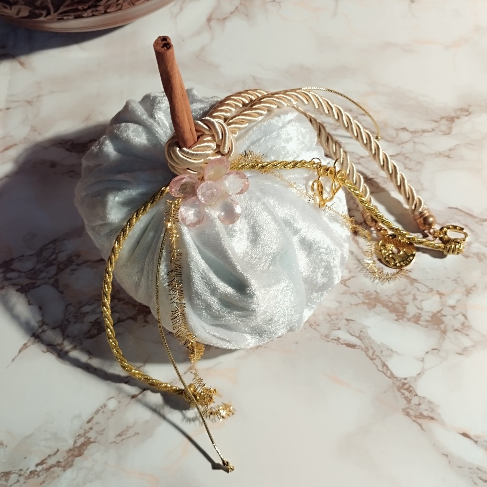 Γούρι 2026 Κολοκύθα Μεγάλη Βελούδο λευκό με χρυσά κορδόνια και Λουλούδι
