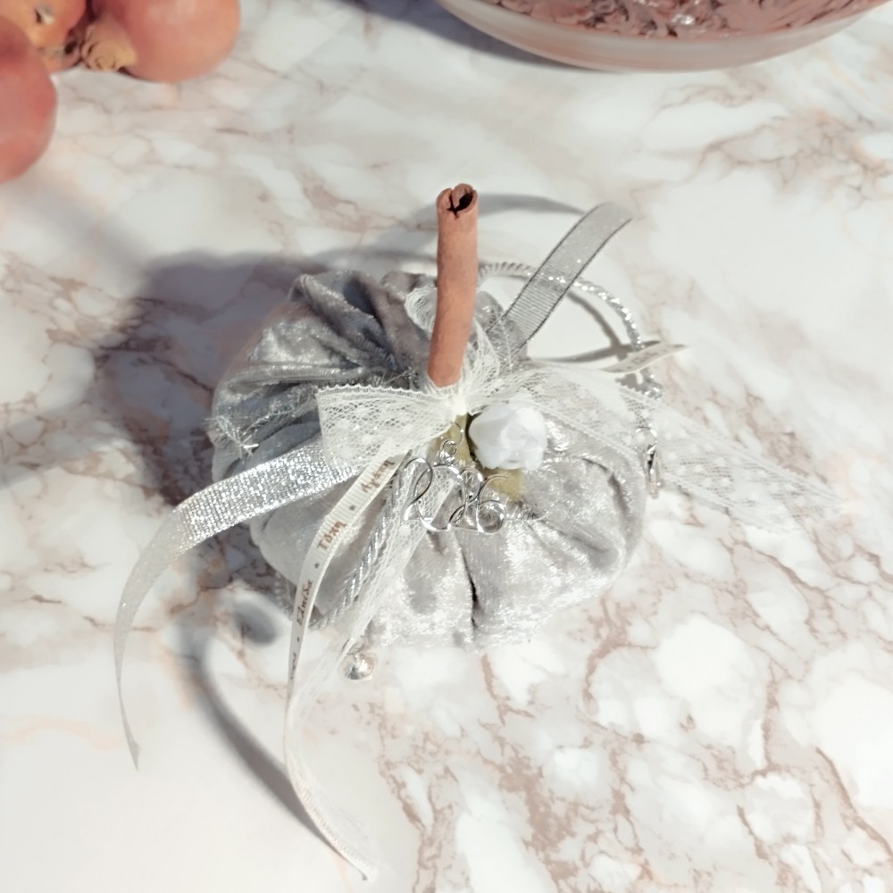 Μεσαία κολοκύθα σε ασημί βελούδο με ασημί γυαλιστερό κορδόνι, κορδέλα με ευχές και λευκή πουά δαντέλα.