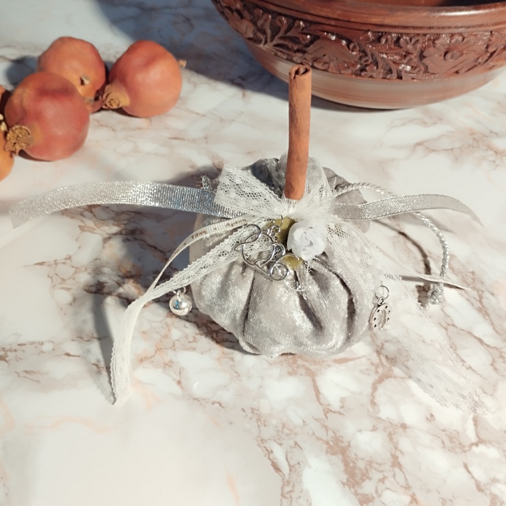 Γούρι 2026 Κολοκύθα Μεσαία Βελούδο ασημί με ασημί κορδέλες και Λουλούδια