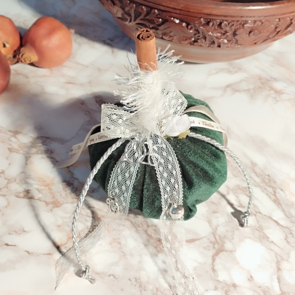 Μεσαία κολοκύθα σε κυπαρισσί βελούδο με ασημί κορδόνι, κορδέλα με ευχές και λευκή πουά δαντέλα.