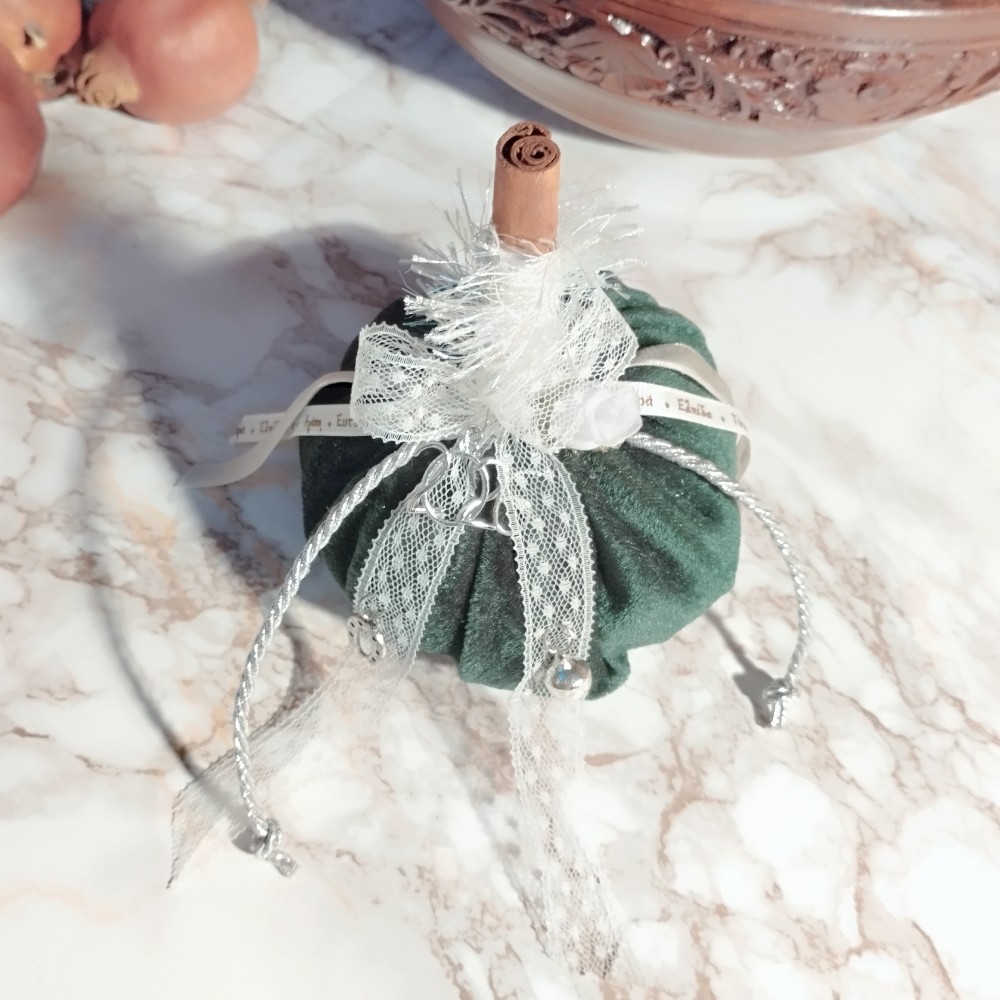 Γούρι 2026 Κολοκύθα Μεσαία Βελούδο κυπαρισσί με ασημί Ιριδίζον Νήμα
