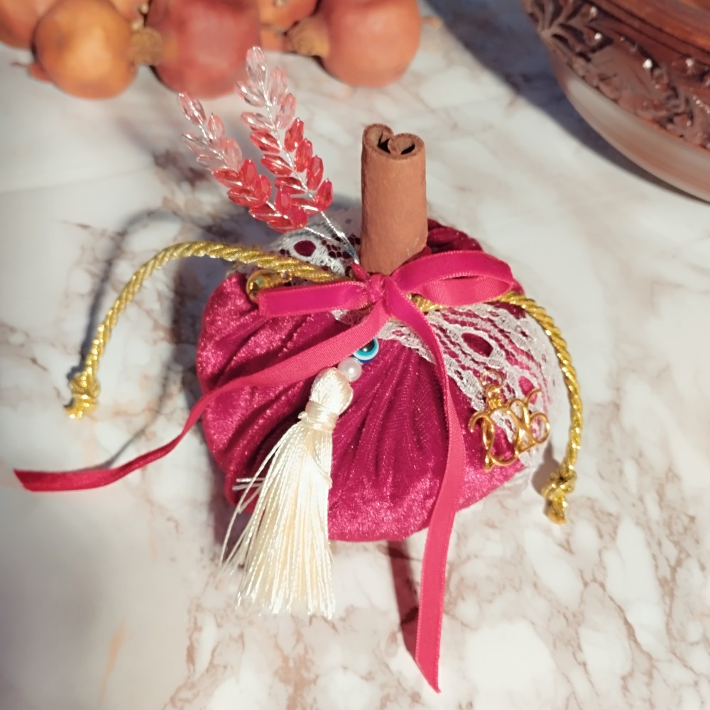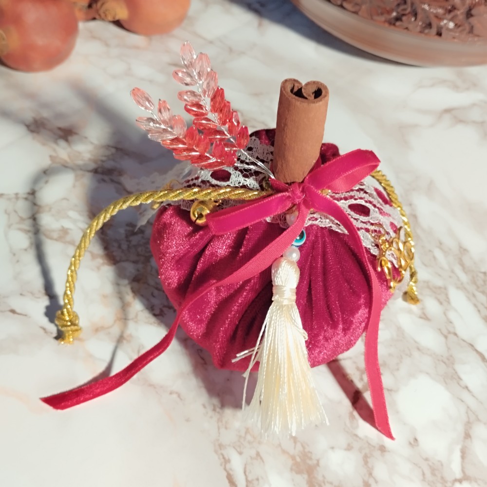 Γούρι 2026 Κολοκύθα Μεσαία Βελούδο μπορντό με εκρού φούντα και Φύλλα Κρυσταλλάκια