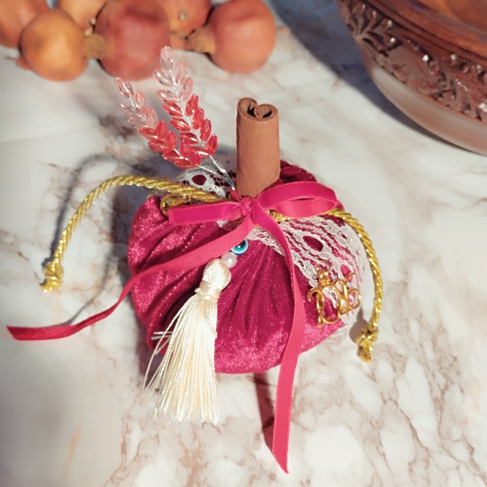 Μεσαία κολοκύθα σε μπορντό βελούδο με λευκή δαντέλα, εκρού φούντα και μπορντό βελούδινη κορδέλα.