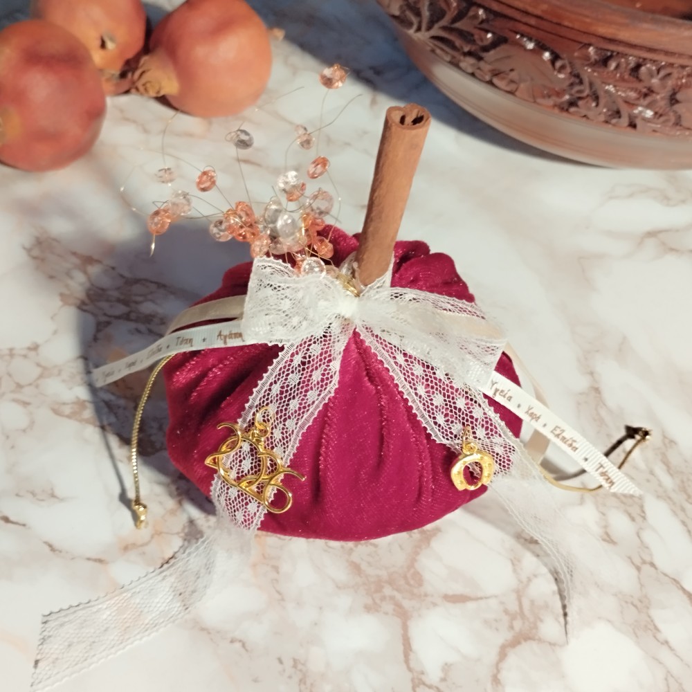 Μεσαία κολοκύθα σε μπορντό βελούδο με λευκή πουά δαντέλα, χρυσό κορδόνι και κορδέλα ευχών.