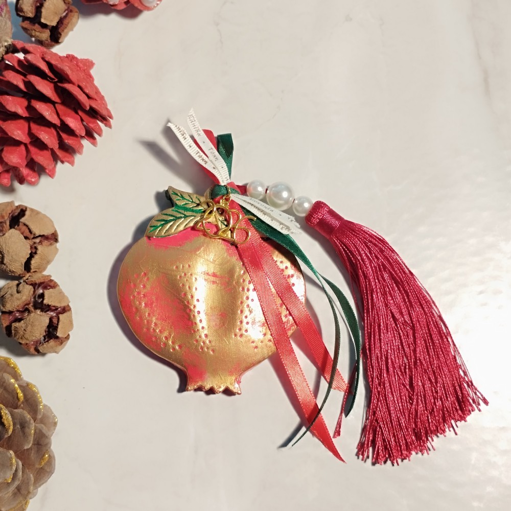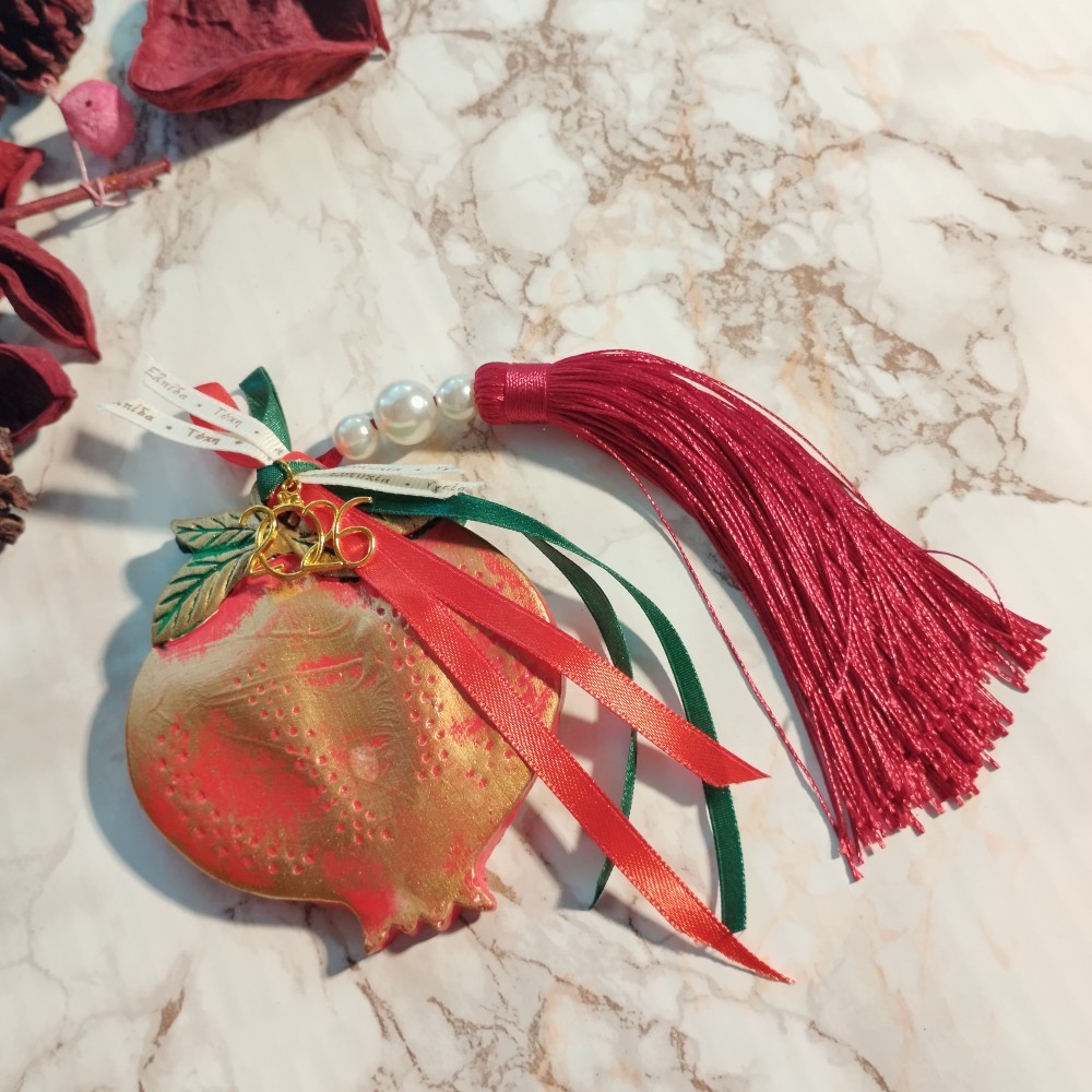 Χειροποίητο, οικονομικό, επιτραπέζιο γούρι 2026 με μεγάλο κεραμικό κόκκινο- χρυσό ρόδι.
