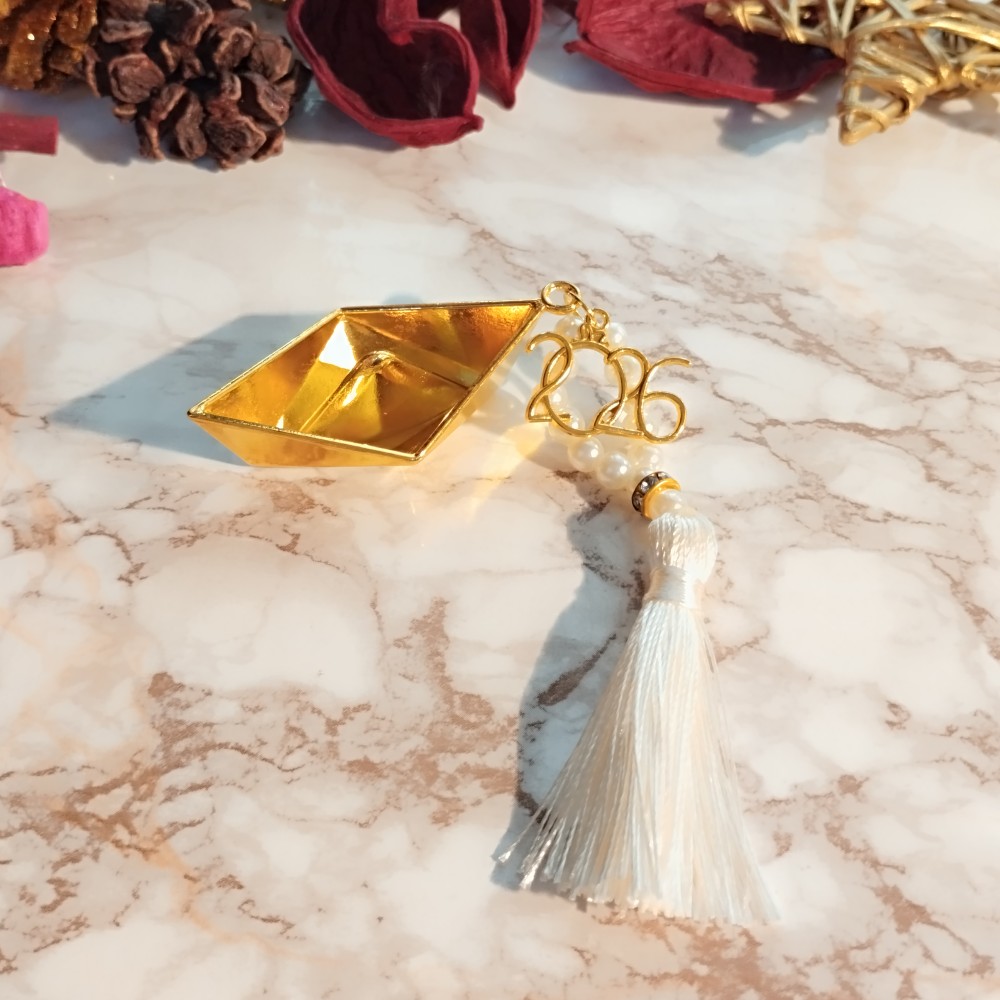Χειροποίητο, οικονομικό, επιτραπέζιο γούρι 2026 με χρυσό καράβι και εκρού πέρλες με εκρού φούντα.