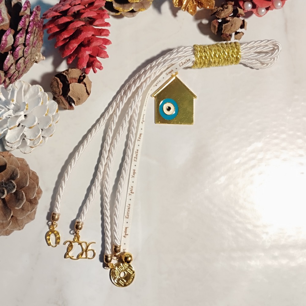 Χειροποίητο, οικονομικό, κρεμαστό γούρι 2026 με μεταλλικό χρυσό σπίτι με μπλε μάτι.