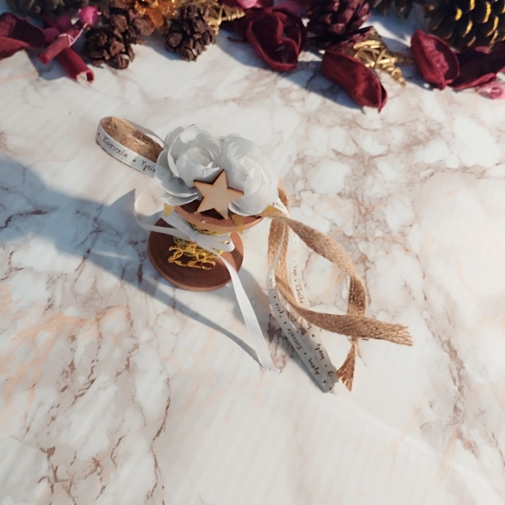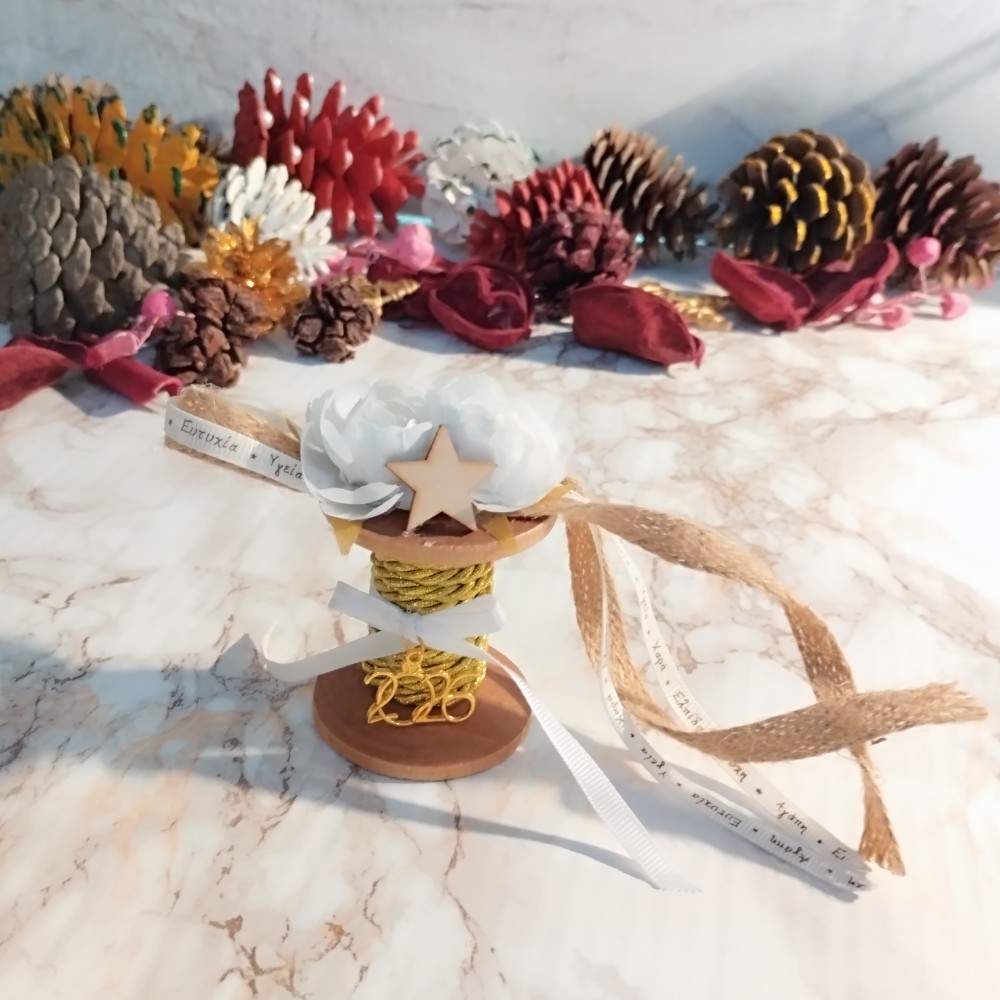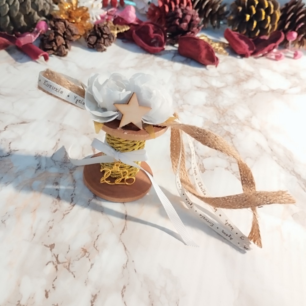 Γούρι 2026 Επιτραπέζιο Μεγάλο Ξύλινο Καρούλι με λευκά Λουλούδια και κορδέλα Ευχών