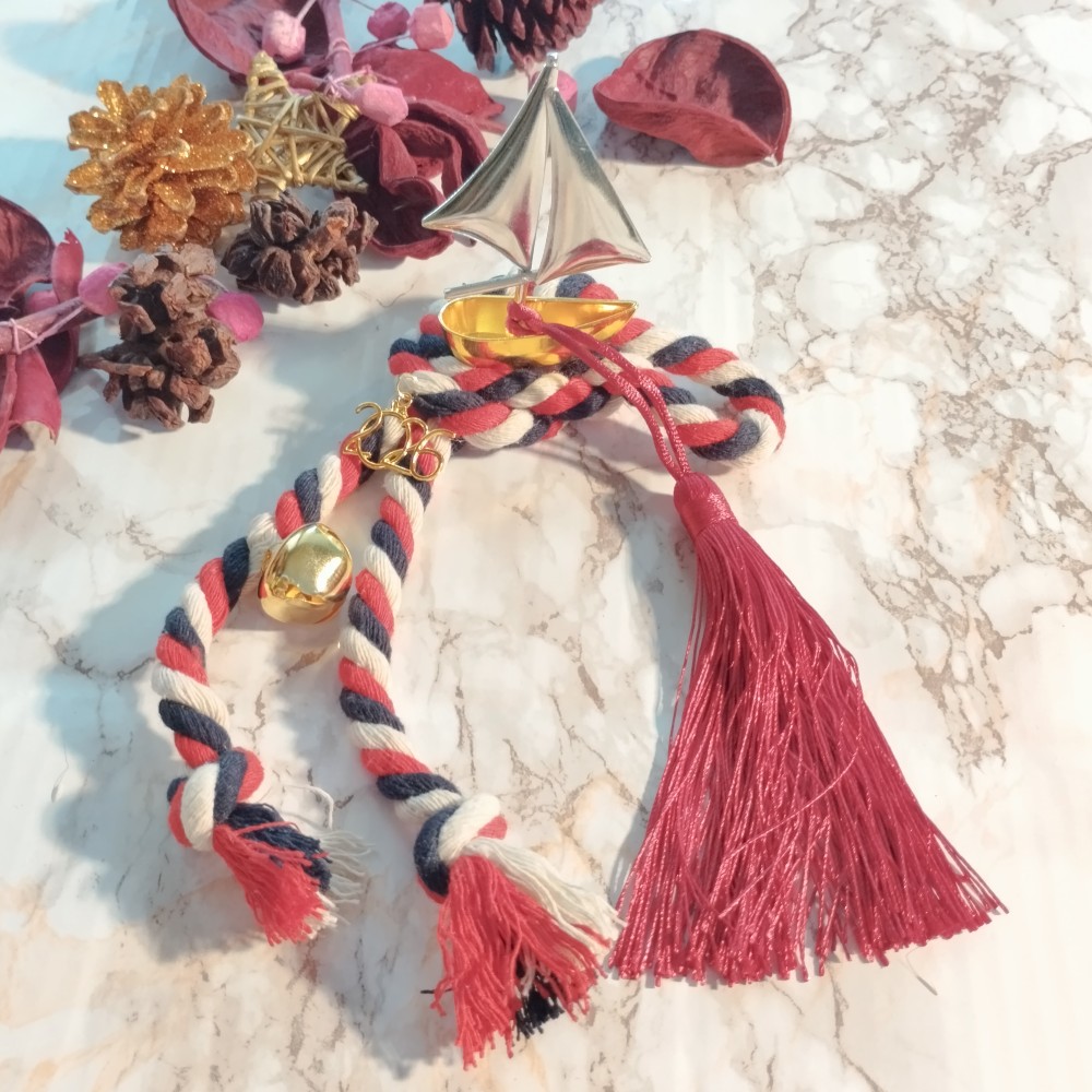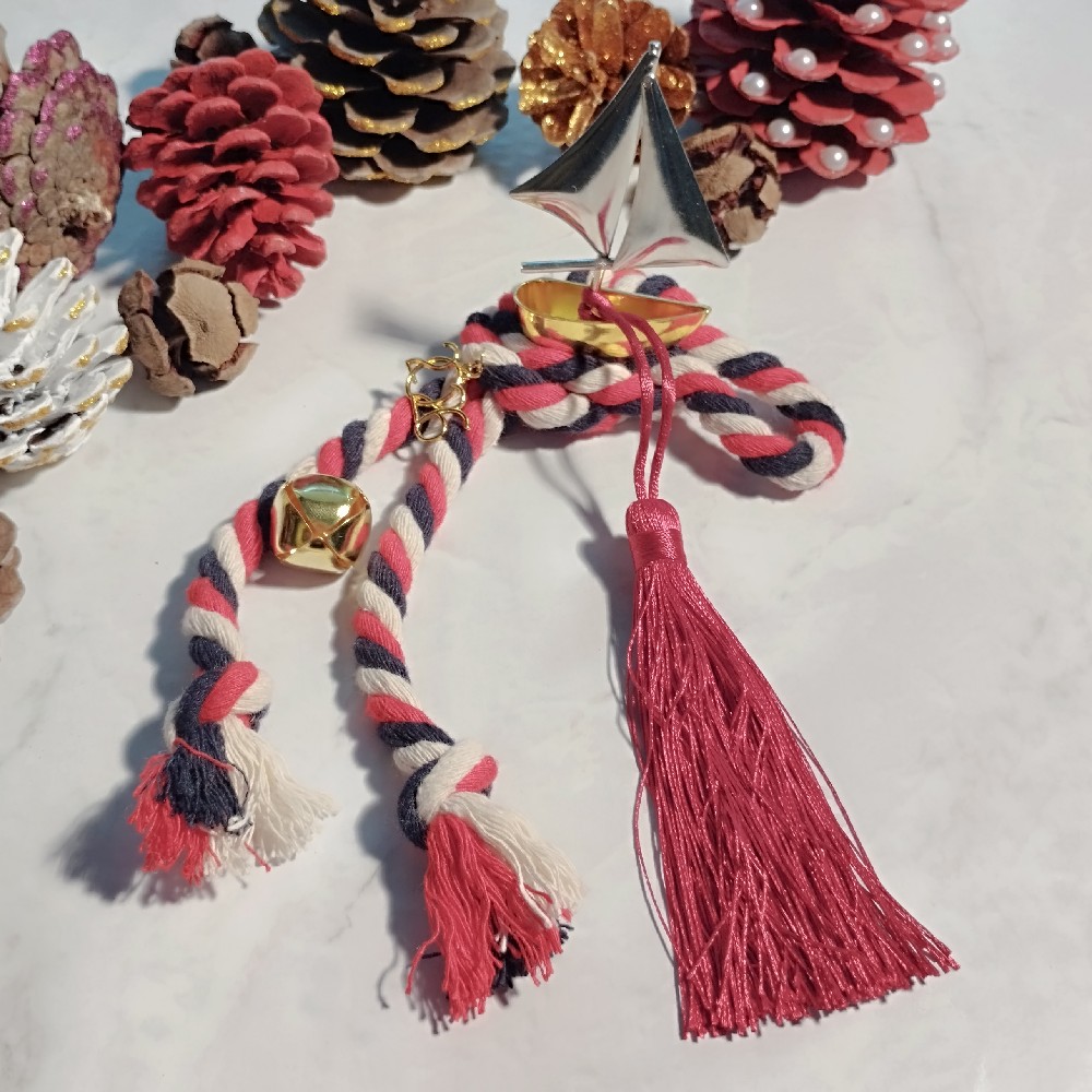 Σε χρυσό και ασημί χρώμα, πάνω σε βαμβακερό κορδόνι.