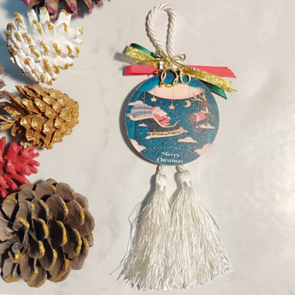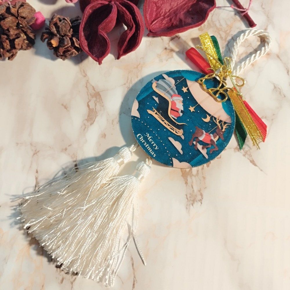 Διακοσμητική έγχρωμη, ξύλινη μπάλα με Santa Claus σε έλκηθρο σε μπλε χρώμα.
