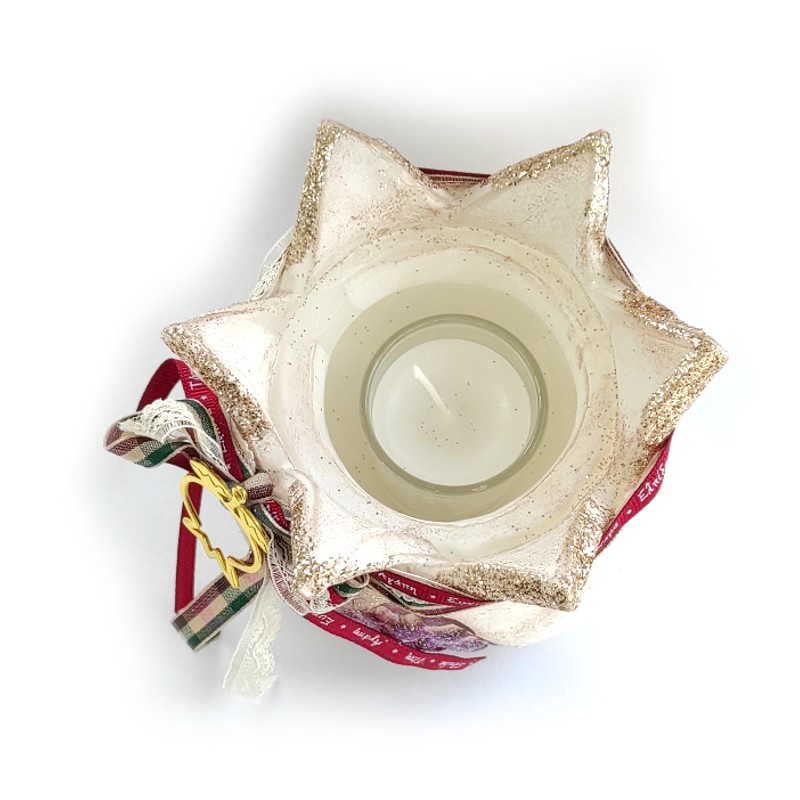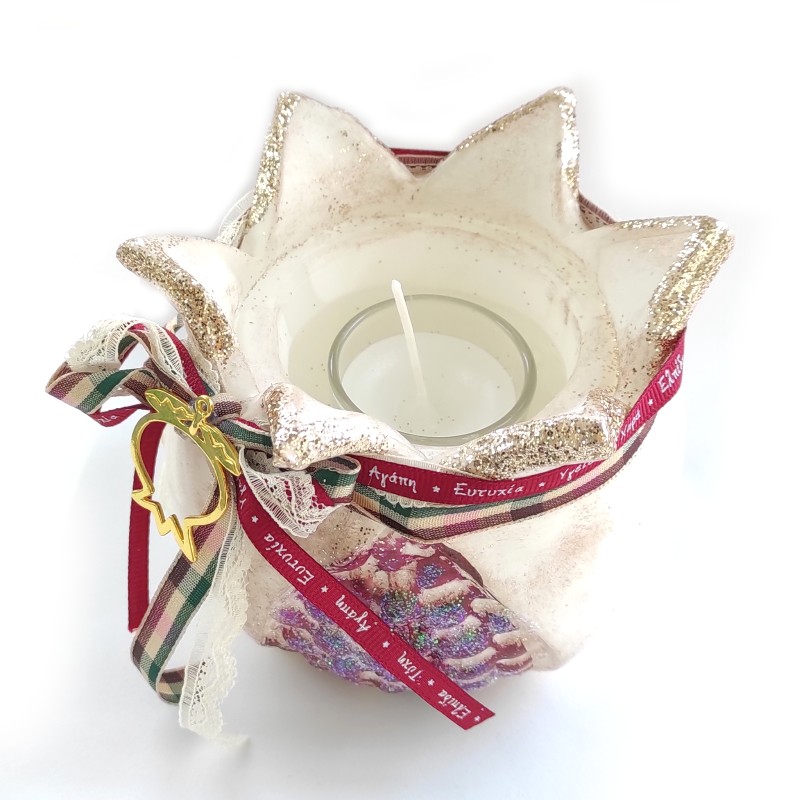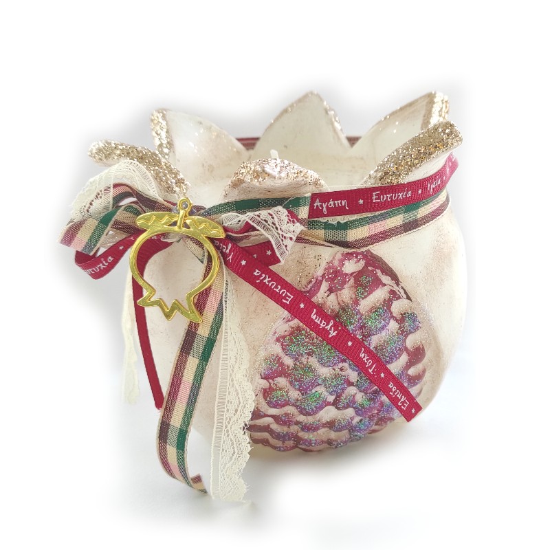 Στολισμένο με κορδέλα ευχών, δάντελα, χρυσόσκονη και χρυσό μεταλλικό ρόδι.