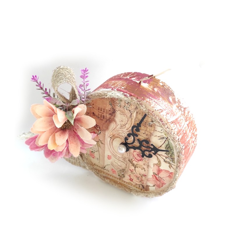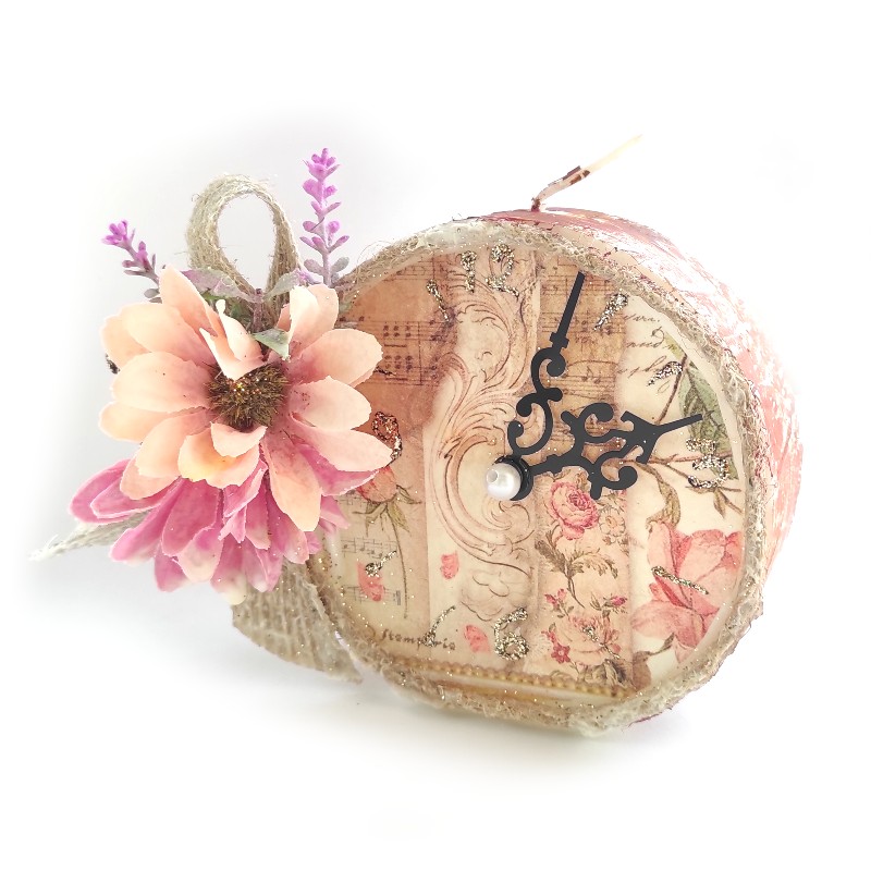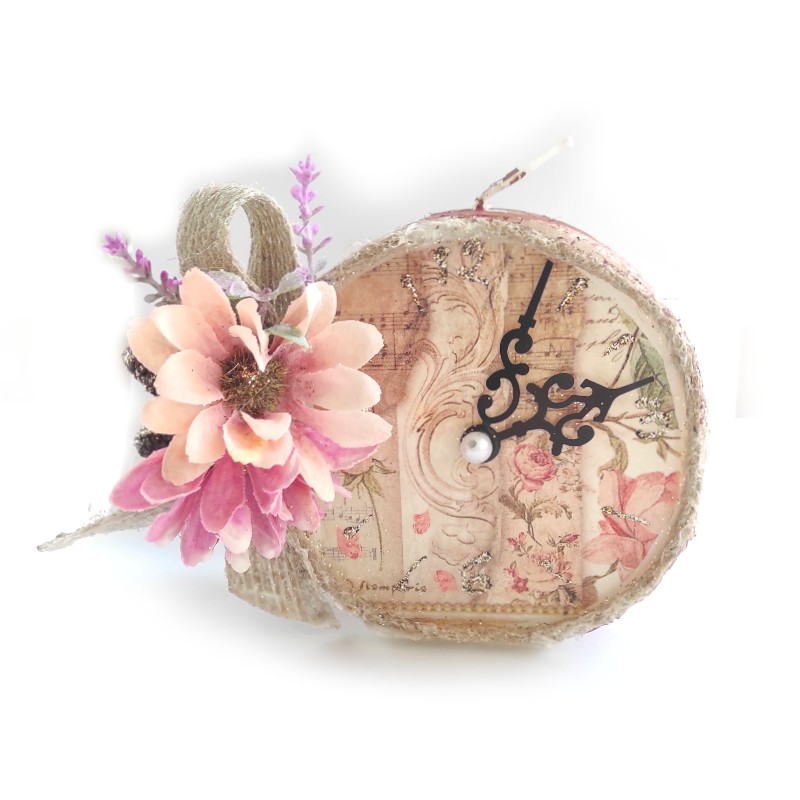 Διακοσμητικό, οικονομικό, χειροποίητο, αρωματικό κερί σε σχέδιο ρολόι και σύνθεση από ροζ και λιλά μαργαρίτες.