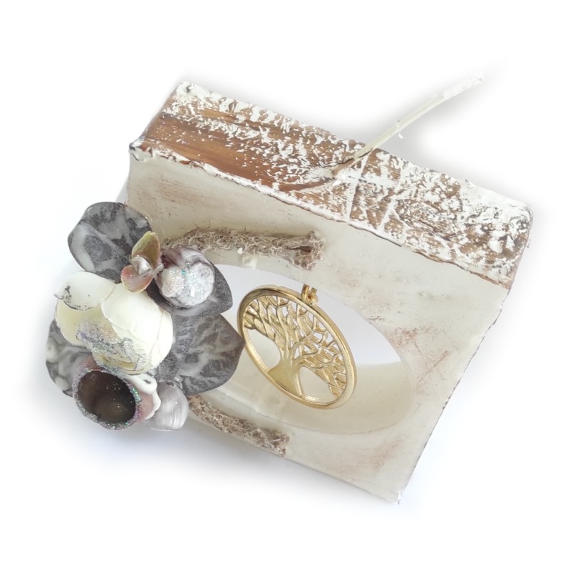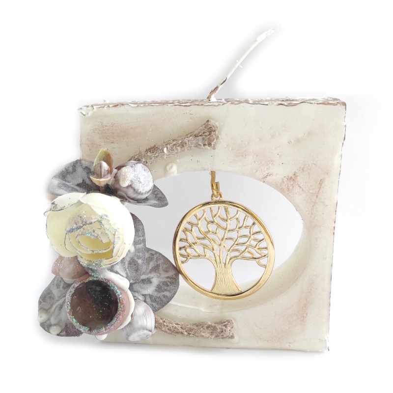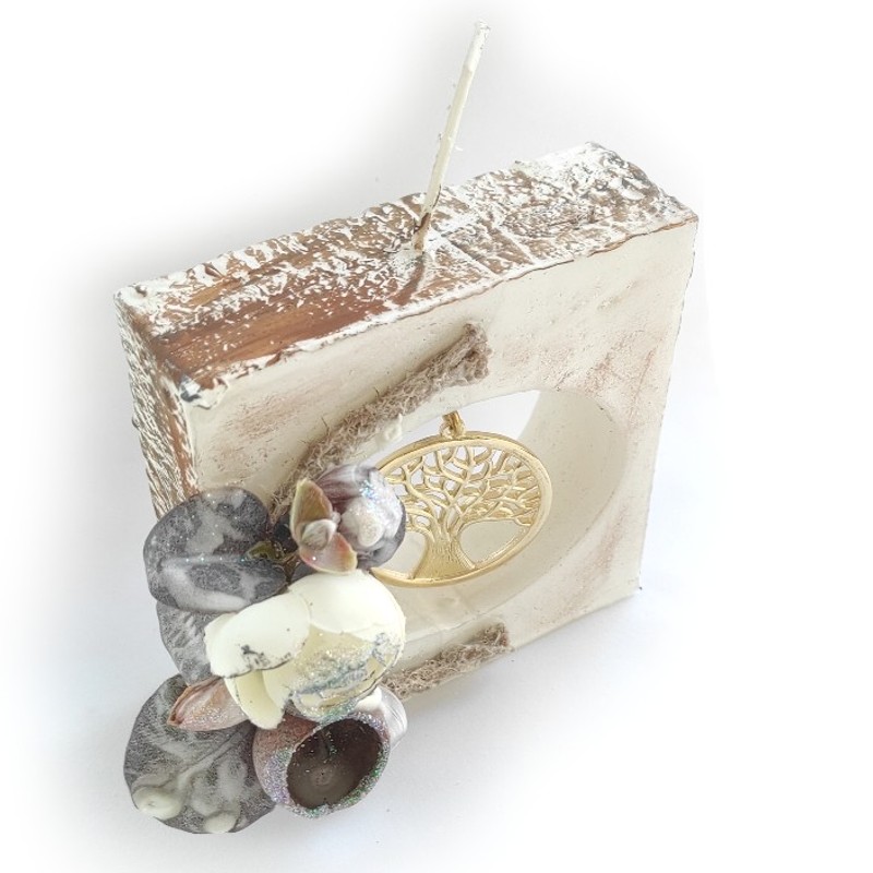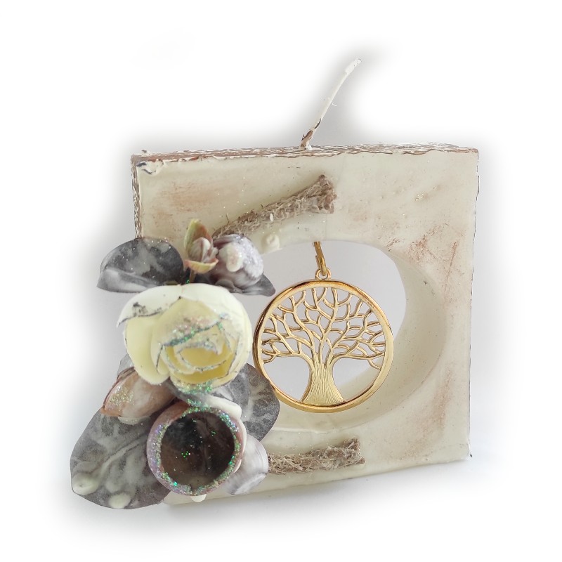 Διακοσμητικό, οικονομικό, χειροποίητο, αρωματικό κερί σε σχήμα τετράγωνο με κρεμαστό χρυσό μεταλλικό στοιχείο δέντρο ζωής.