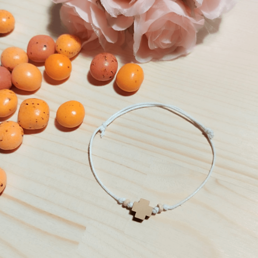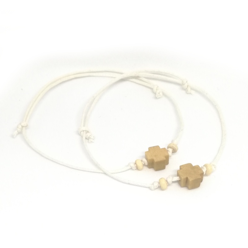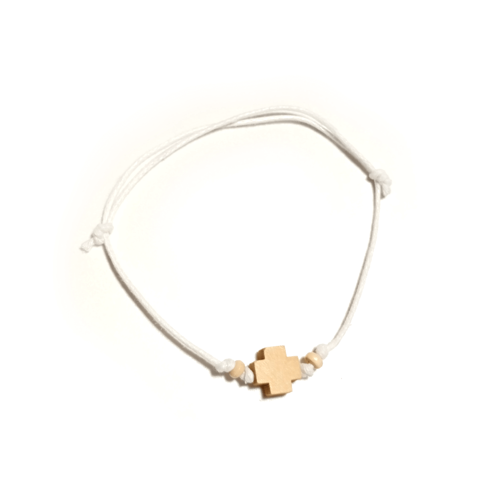 Με λευκό κορδόνι και ξύλινο πλακέ φυσικό σταυρό.