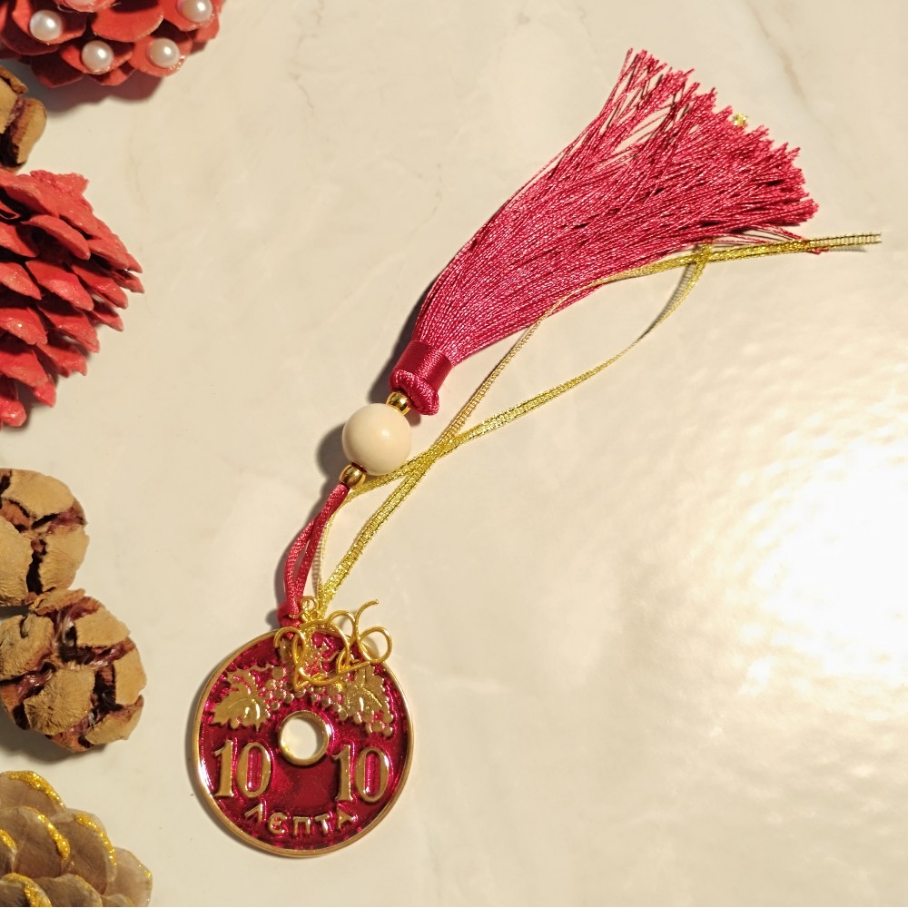 Χειροποίητο, οικονομικό γούρι 2026 με μεγάλη μπορτώ- χρυσή μεταλλική δεκάρα.