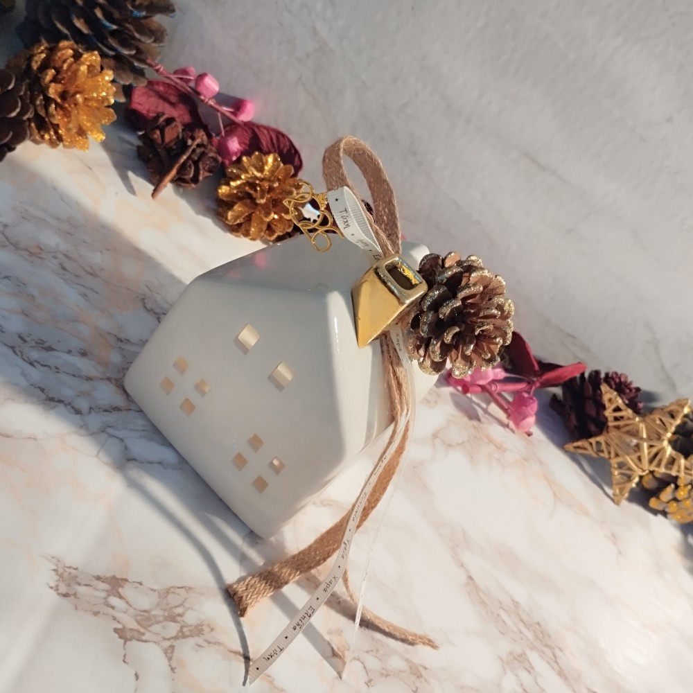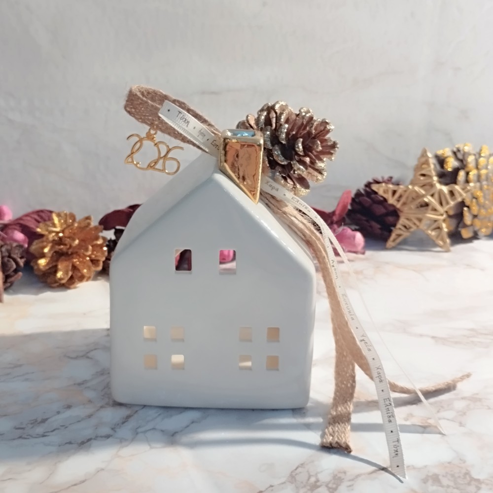 Χειροποίητο, οικονομικό επιτραπέζιο γούρι 2025 – διακοσμητικό μεγάλο κεραμικό σπίτι σε λευκό και χρυσό χρώμα.