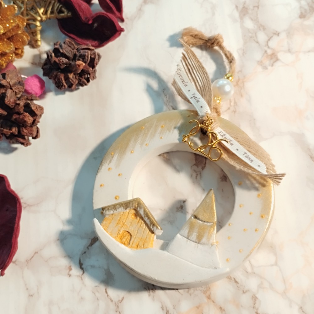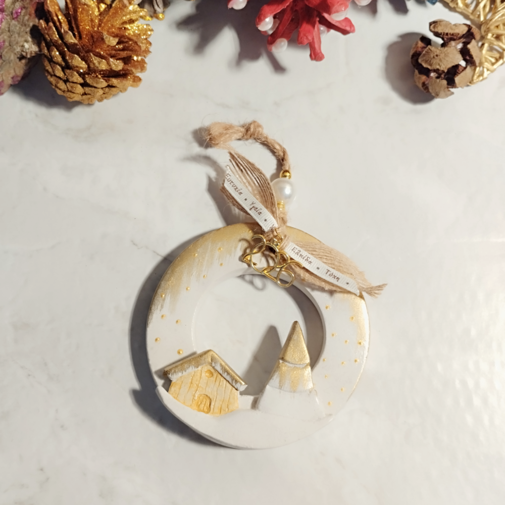 Χειροποίητο, οικονομικό, κρεμαστό γούρι 2026 χρυσός & εκρού κεραμικός κρίκος με σπιτάκι και έλατο.