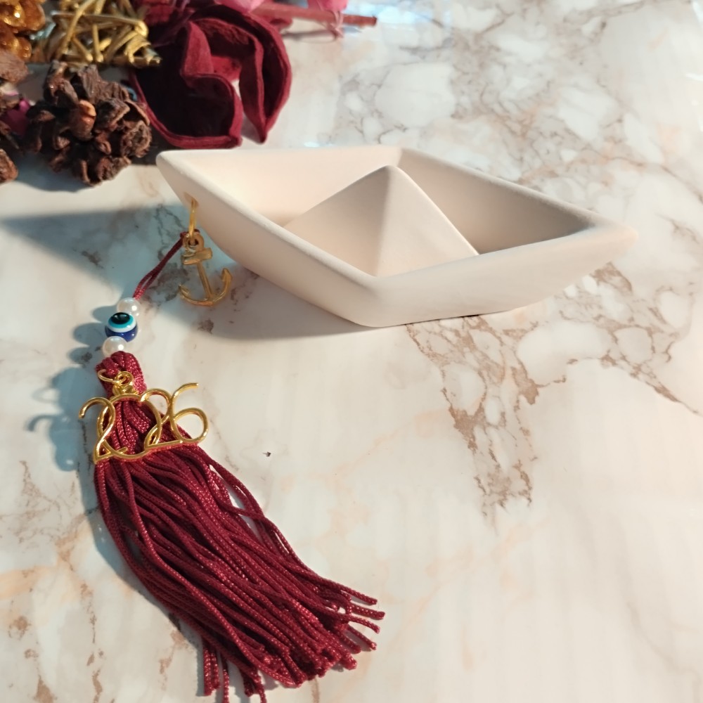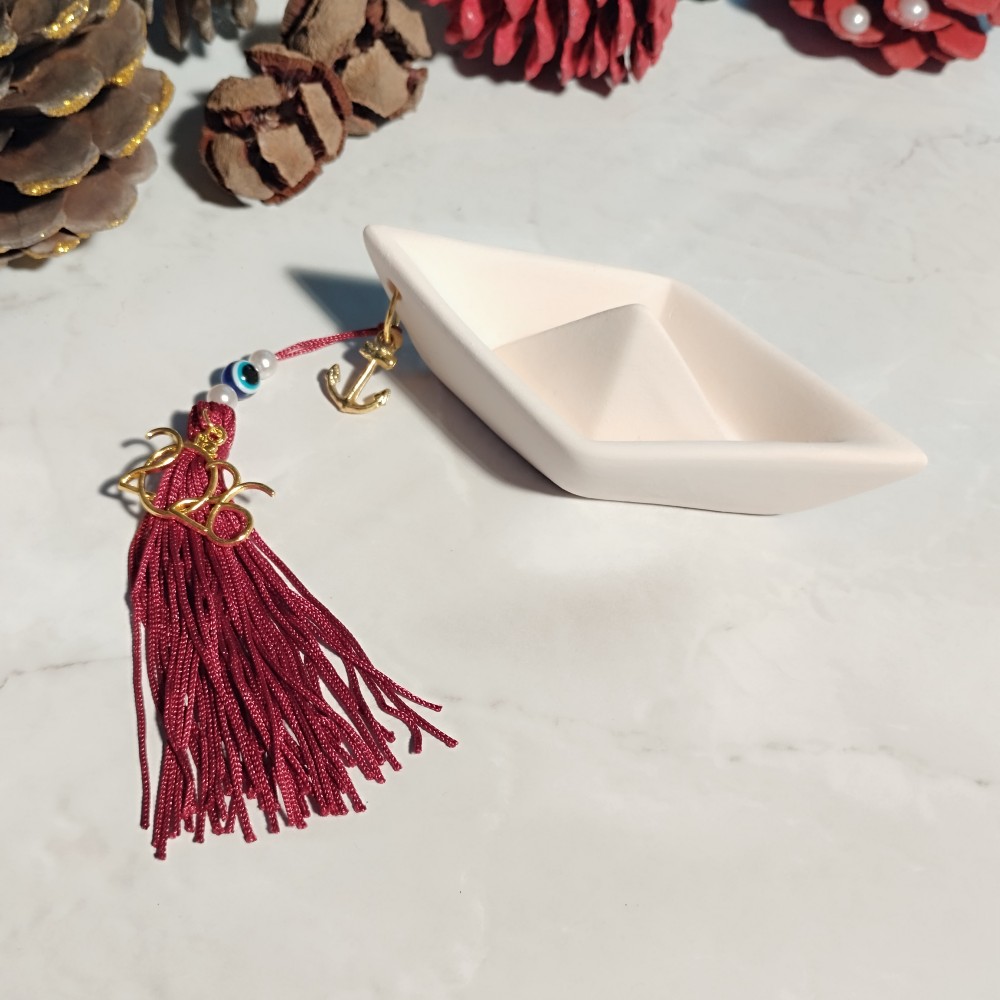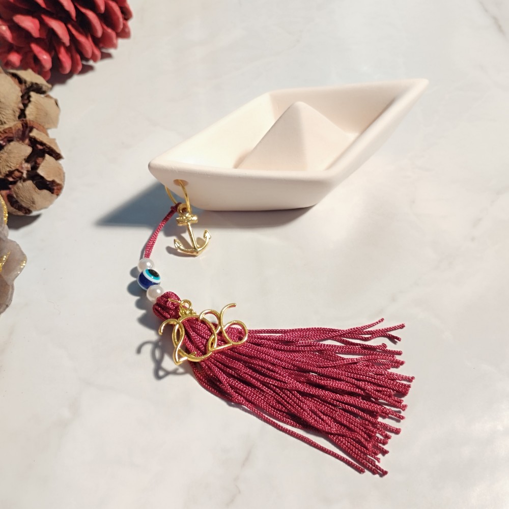 Στολισμένο με μπορντό φούντα και χρυσή άγκυρα.