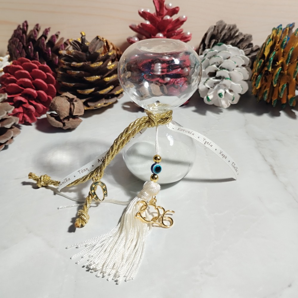 Χειροποίητο, οικονομικό, επιτραπέζιο γούρι 2026 γυάλινη κλεψύδρα.