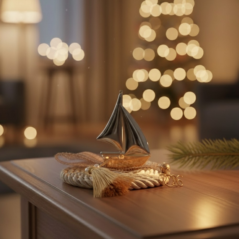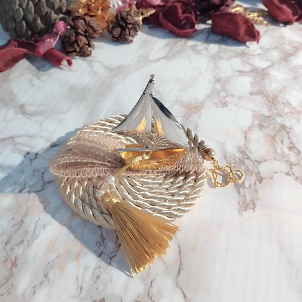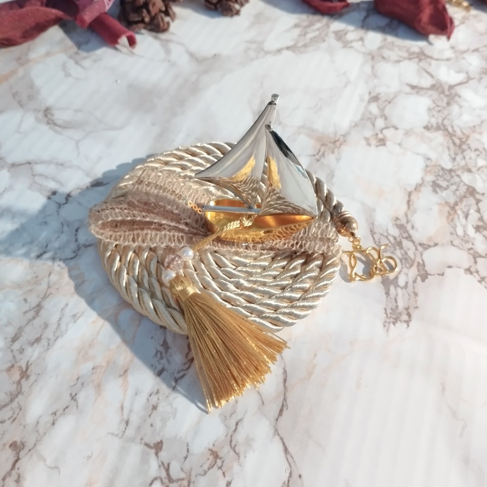 Χειροποίητο, οικονομικό, επιτραπέζιο γούρι 2026 με χρυσό και ασημί μεταλλικό καραβάκι.
