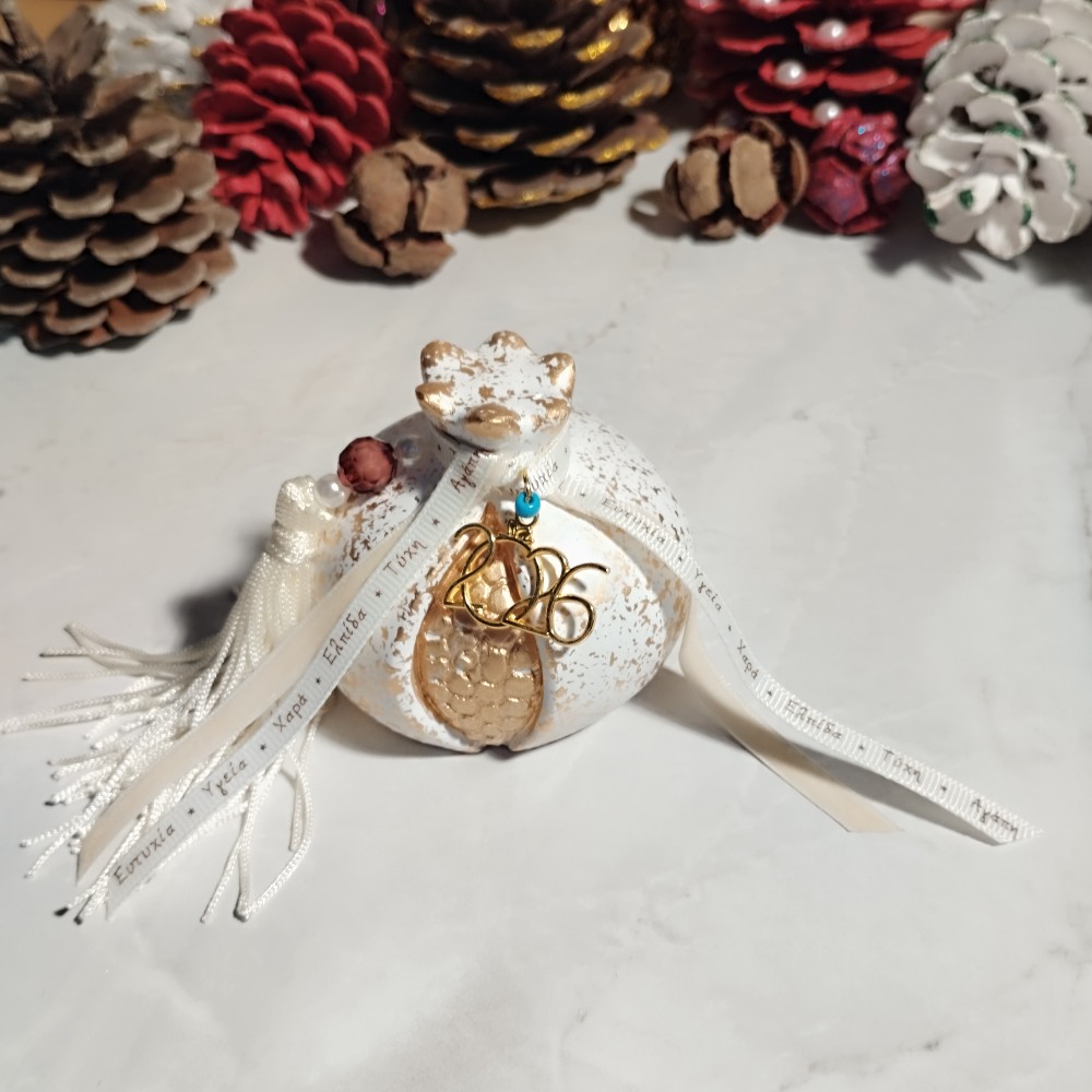 Γούρι 2026 Επιτραπέζιο Κεραμικό χρυσό και εκρού Ρόδι