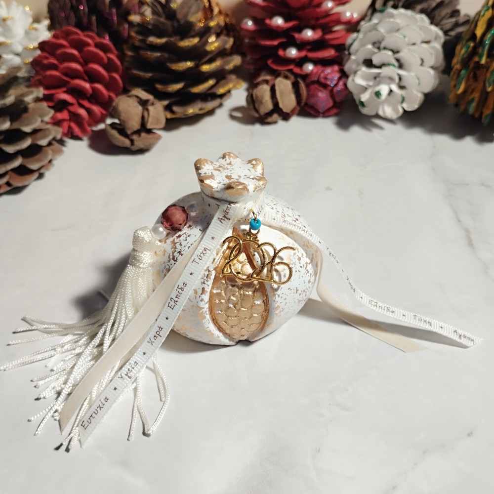 Χειροποίητο, οικονομικό, επιτραπέζιο γούρι 2026 κεραμικό ρόδι σε χρυσό και εκρού.
