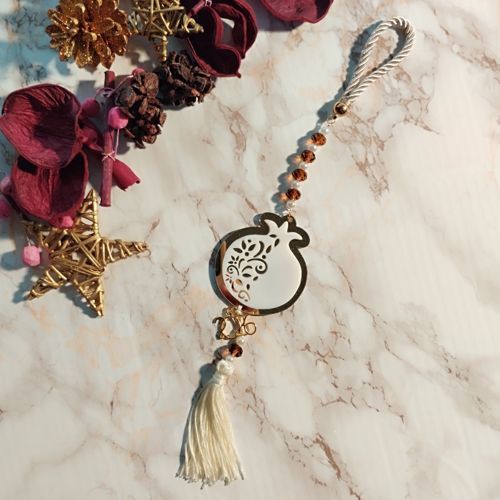 Χειροποίητο, οικονομικό, κρεμαστό γούρι 2026 με ρόδι από πλέξι σε λευκό και χρυσό χρώμα με ανάγλυφο σχέδιο στο εσωτερικό του.