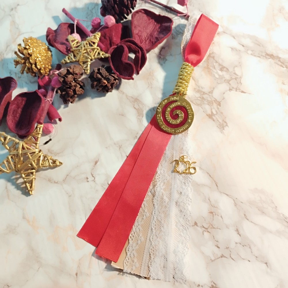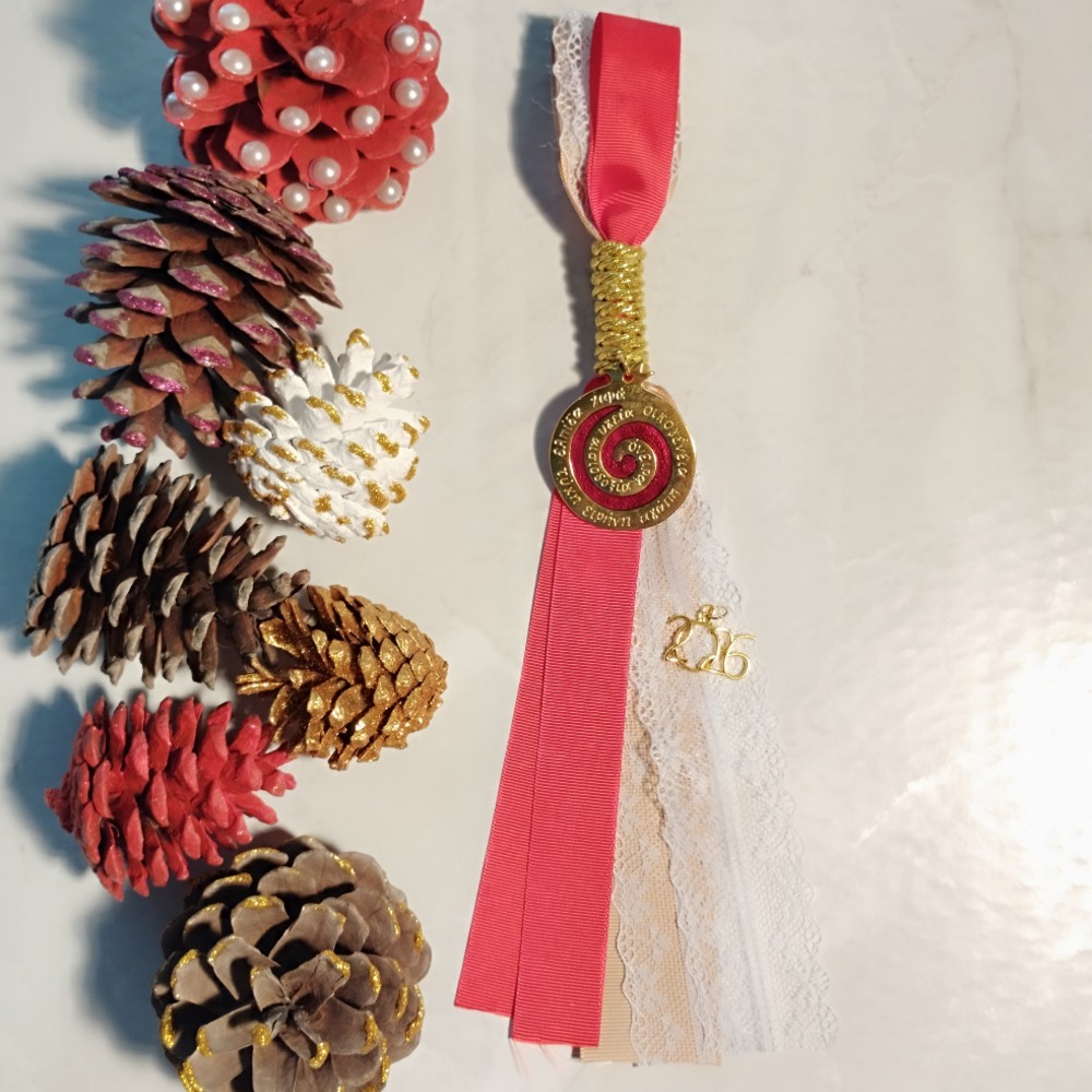 Χειροποίητο, οικονομικό, κρεμαστό γούρι 2026 με μεταλλικό χρυσό ρόδι με μπορντό σμάλτο και ευχές.