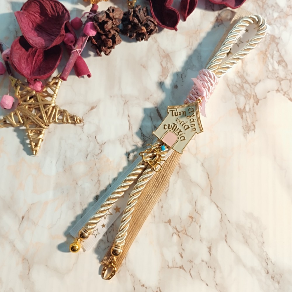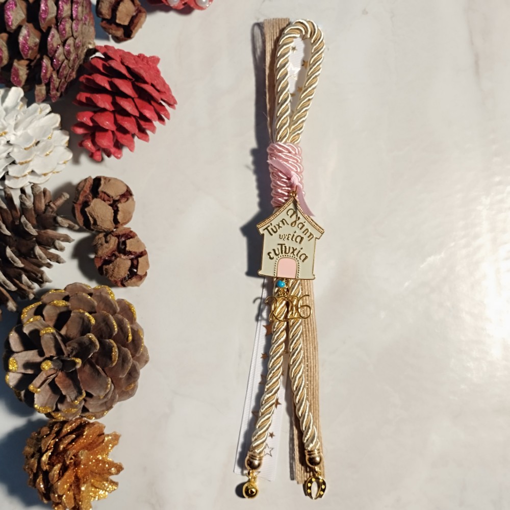 Χειροποίητο, οικονομικό, κρεμαστό γούρι 2026 με μεταλλικό χρυσό σπίτι με ευχές και εκρού- ροζ σμάλτο.