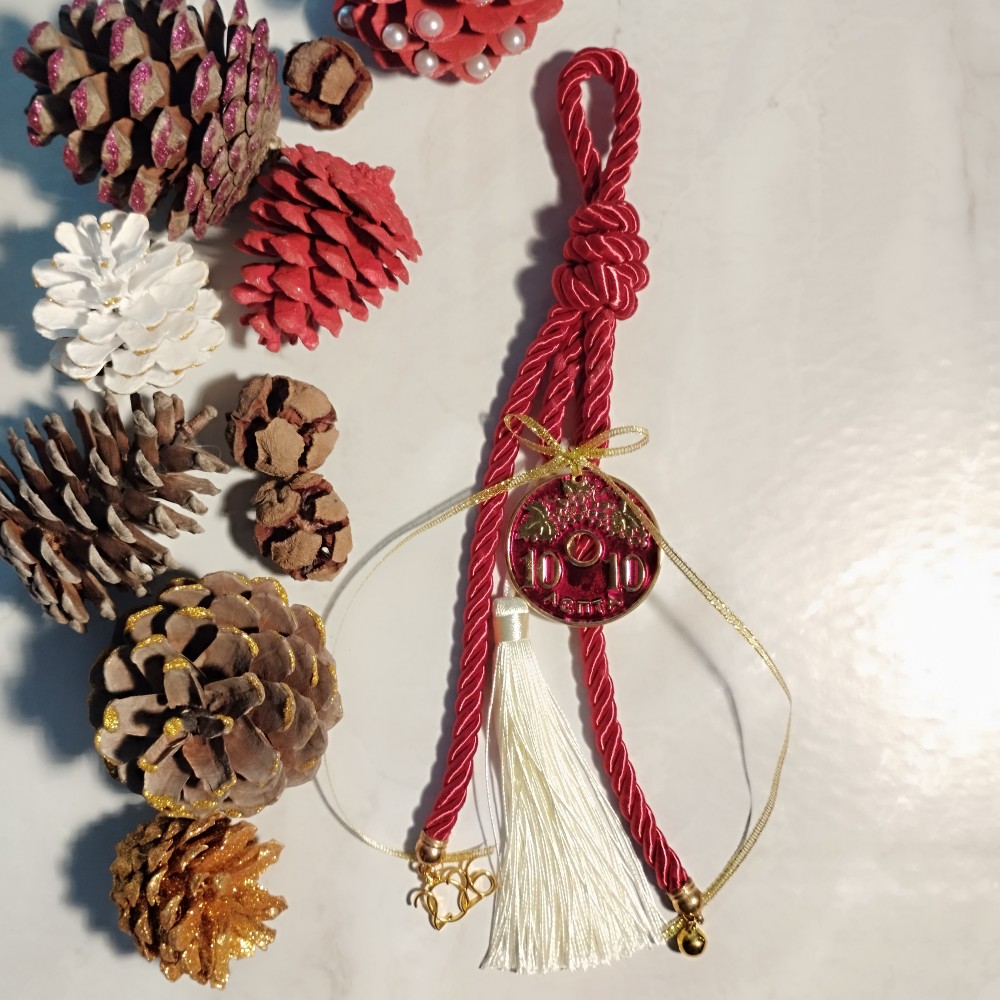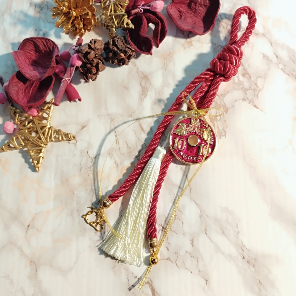Χειροποίητο, οικονομικό, κρεμαστό γούρι 2026 με μεταλλική χρυσή δεκάρα και μπορντό σμάλτο.