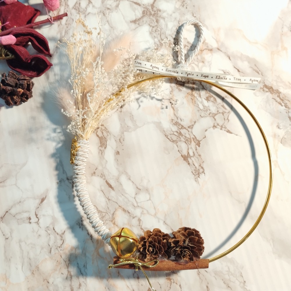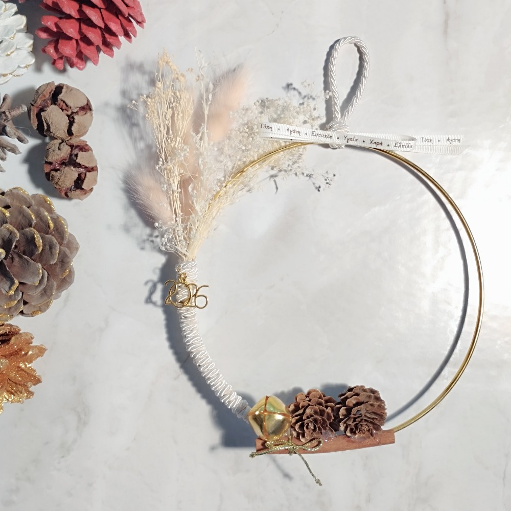 Γούρι 2026 Μεταλλικό χρυσό Στεφάνι με Αποξηραμένα Λουλούδια