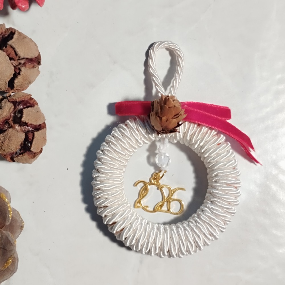 Χειροποίητο, οικονομικό, κρεμαστό γούρι 2026 με ξύλινο πορτοκαλί κρίκο “ντυμένο” με εκρού γυαλιστερό κορδόνι.