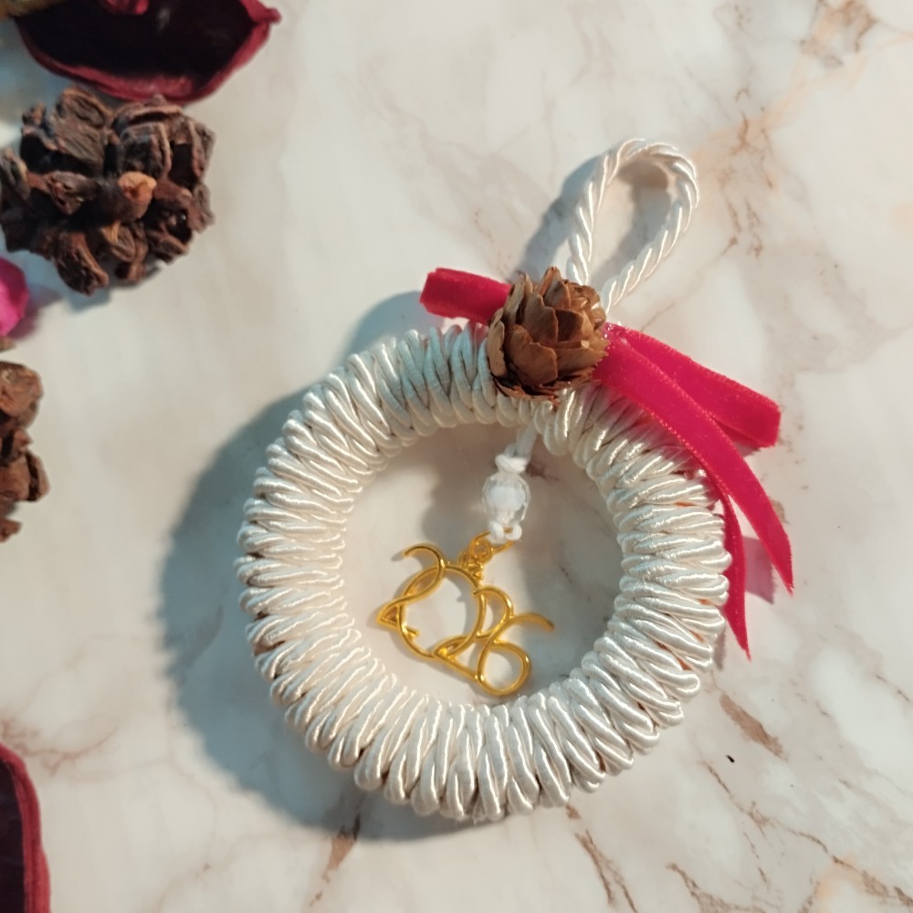 Διακοσμημένο με κορδέλα ευχών, κουκουνάρι και χάντρες.