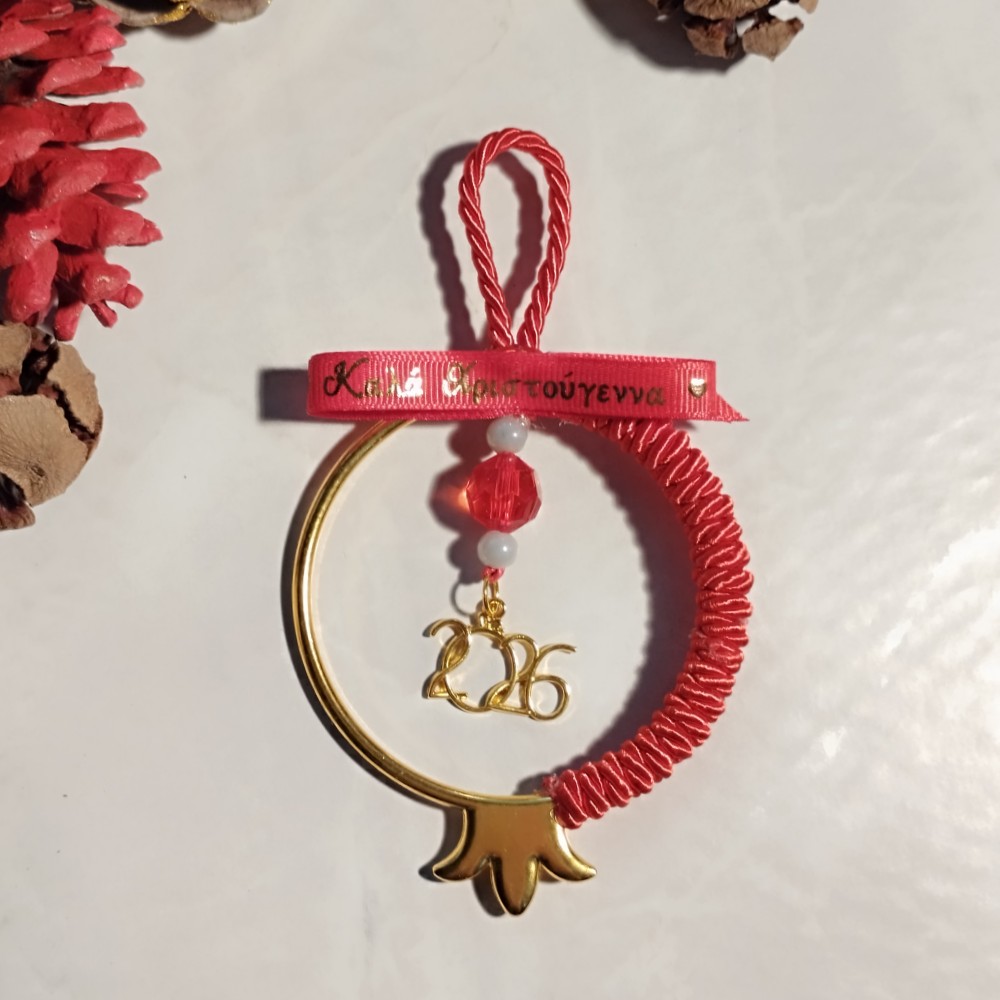 Χειροποίητο, οικονομικό, κρεμαστό γούρι 2026 με χρυσό κρίκο σε σχήμα ρόδι “ντυμένο” με κόκκινο κορδόνι.